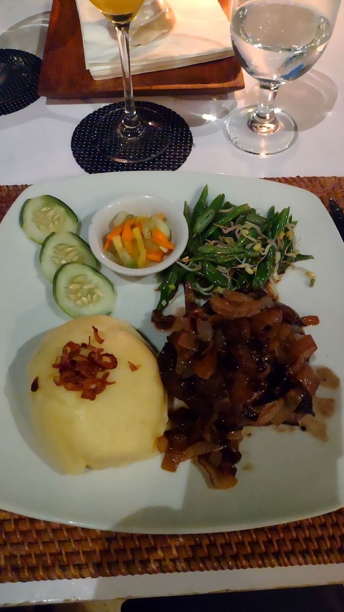 We stopped in for dinner on our last night in Amed. Stunning ocean views and really lovely staff. My husband had chicken satay entree, fish in banana leaf main, and crepe dessert. I had the tomato bruschetta entree, black pepper beef main, and banana boat dessert (with some cocktails during the night too). It was all beautiful! Really tasty. Take the time to stop by, it's a great little place!