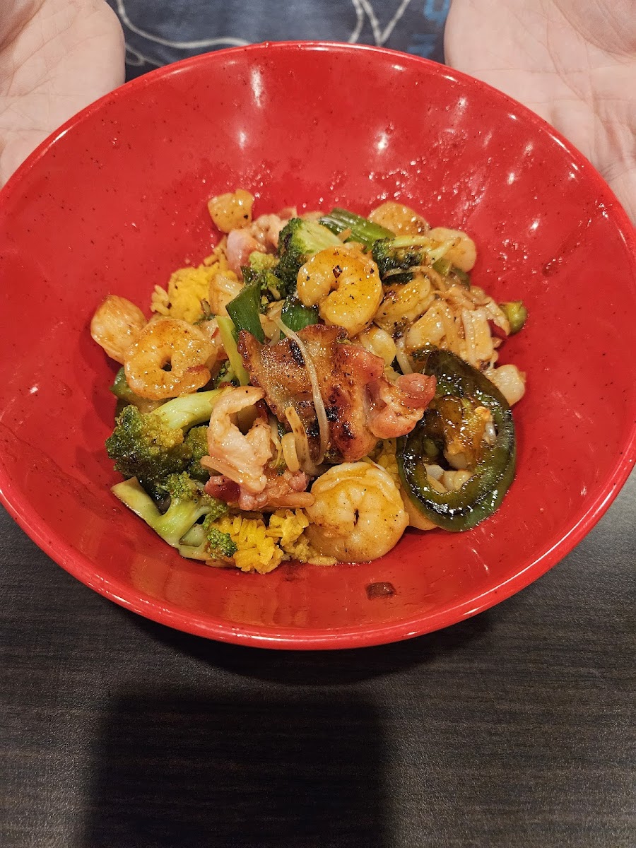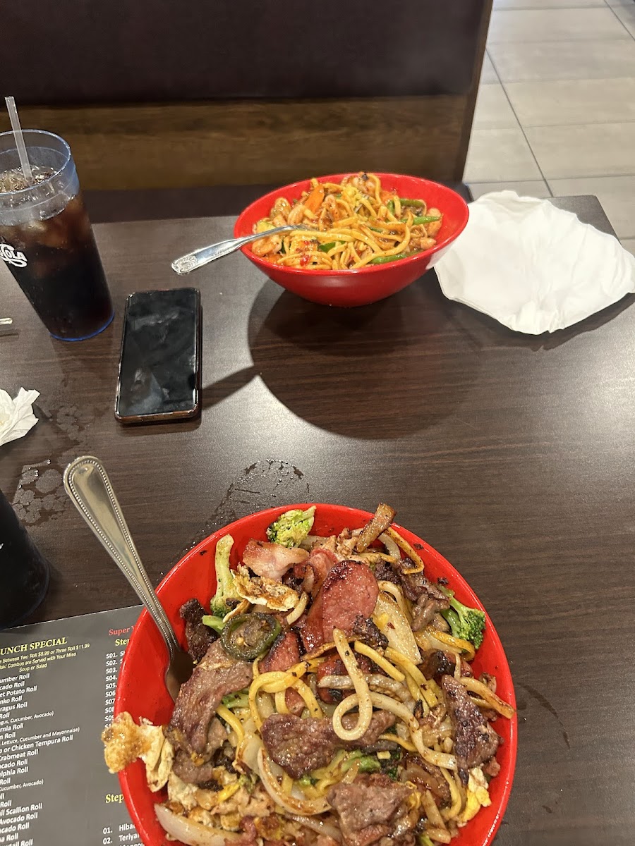 A Unique Dining Experience This was our fourth time dining here, and it remains just as enjoyable as ever. The concept is simple but fun: build your own bowl from a wide selection of fresh ingredients, add your choice of spices and sauces, and leave your tray with a table card that has your name and table number. The hibachi chef grills your meal while you return to your table to wait, and a server brings it out once it’s ready. I only took a few photos this time since the only thing that changes is the ingredients you choose. It’s worth noting that this place can get busy, especially on weekends, so we prefer coming on weekdays. Service is consistently good, the restaurant is clean, and the buffet bar always looks fresh. This visit was just as great as the previous ones. We highly recommend trying it. Our meal—two yummy bowls—came to $35.95 with tax (before tip), which is very reasonable. Plus, parking is free and plentiful. Bon appétit!