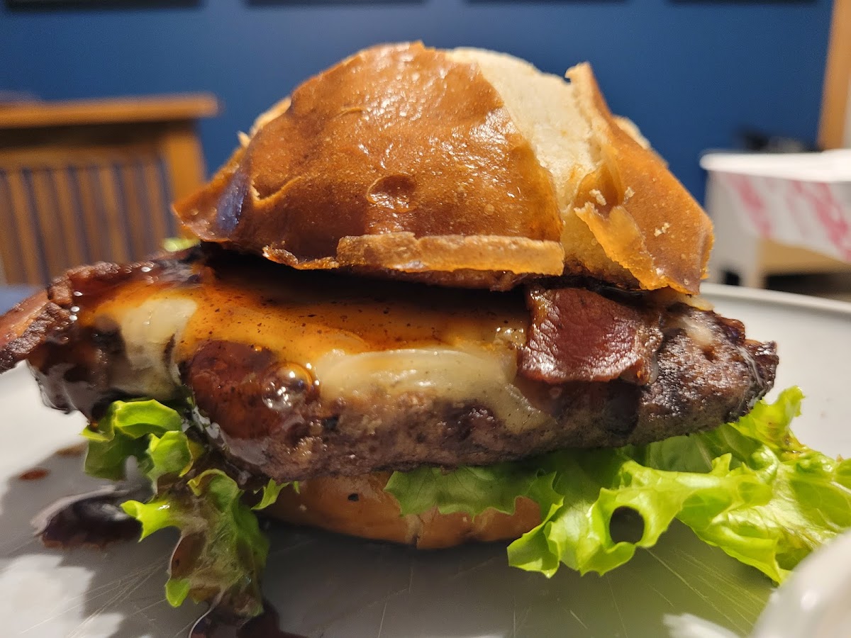 Drove through Peoria and picked up food to go. Ordered a Bundaburg (jalepeno bacon and pepper jack cheese burger) and it absolutely delivered. Thick, juicy patty with great flavor, crispy bacon, melted cheese, and a soft pretzel bun that actually holds up. Portions are generous and delicious. Exactly what you hope for when you order a burger. Will definitely be back.