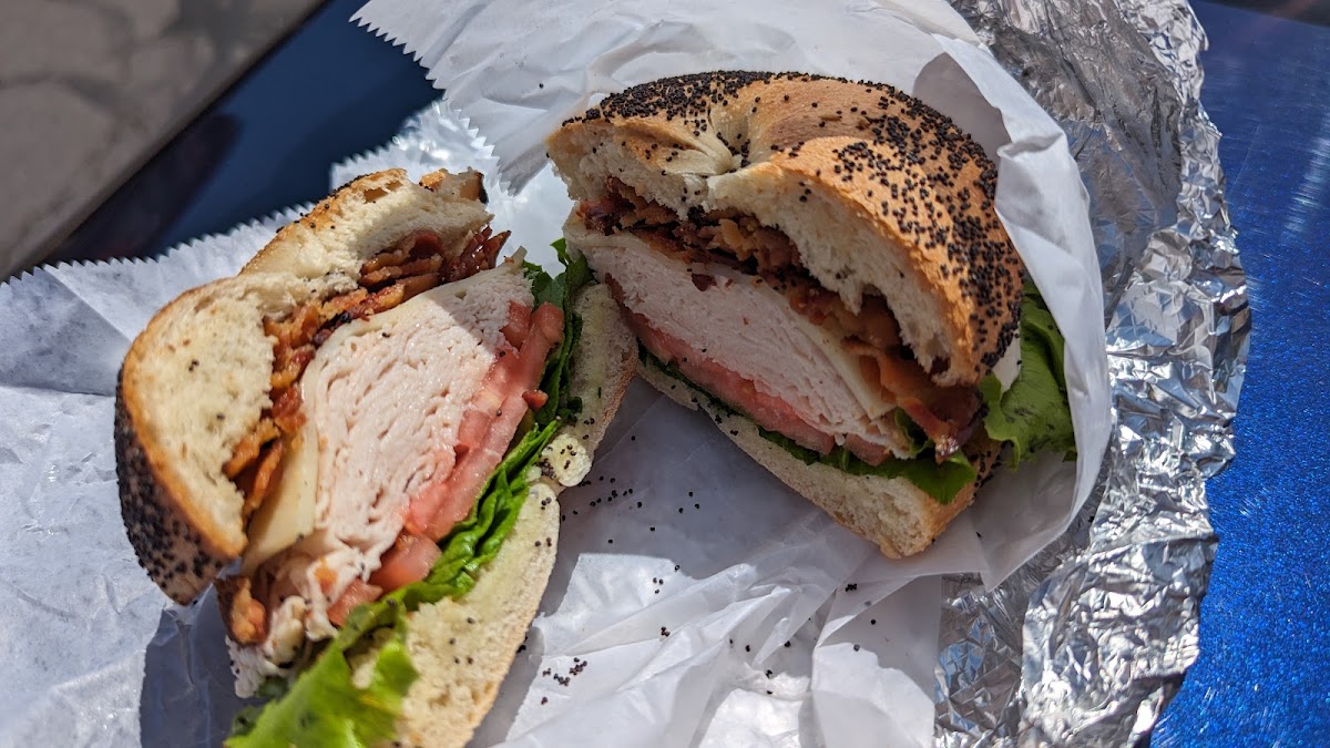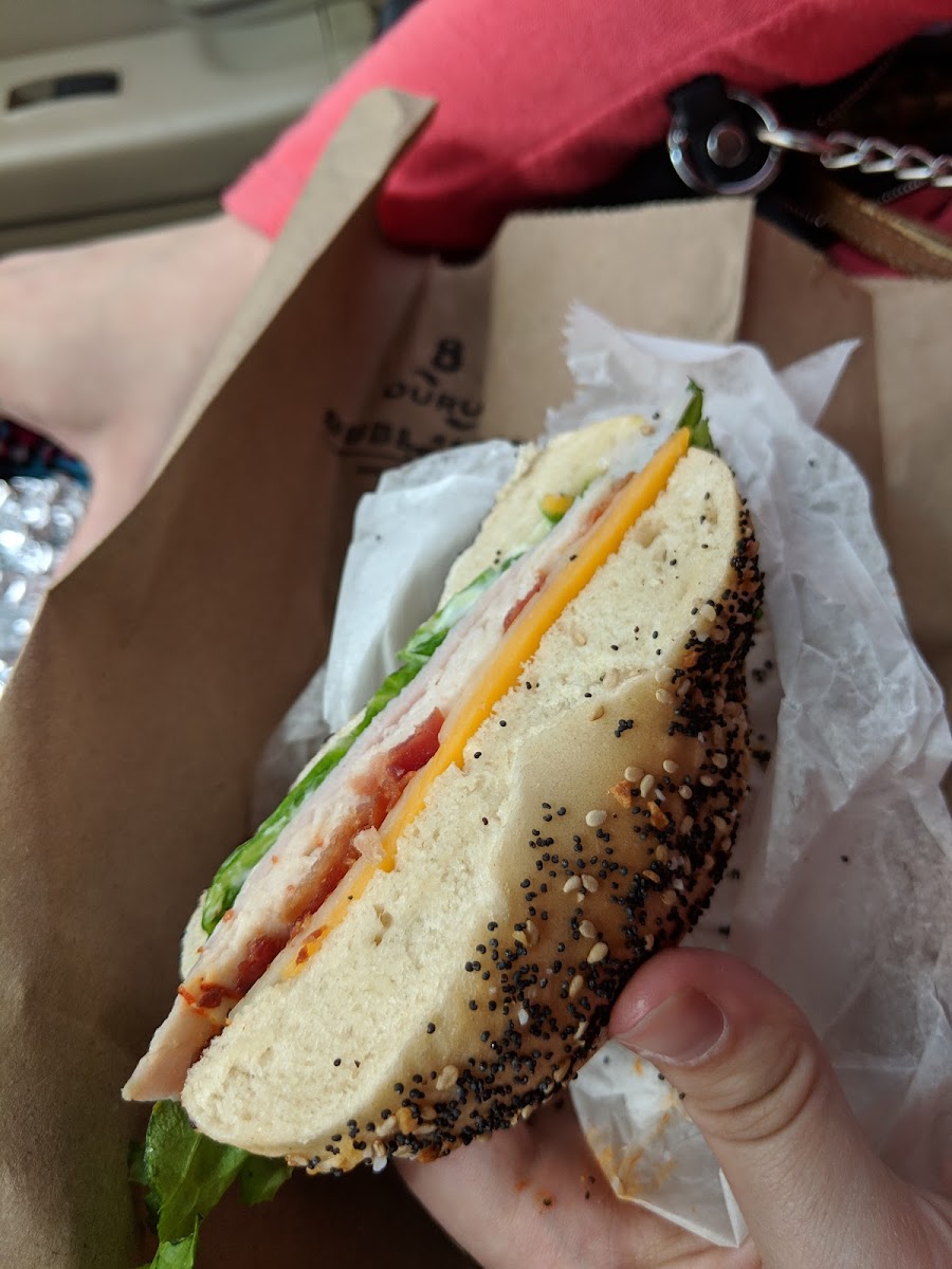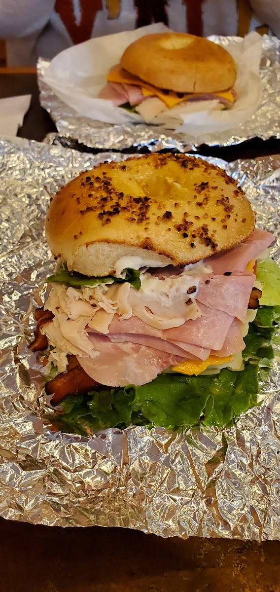 We stopped in for lunch. I had a bagel art club on a garlic bagel. It was well filled with delicious meat and toppings. Delicious. You can't leave without taking a few bagels home. So many to choose from. It's hard to decide.