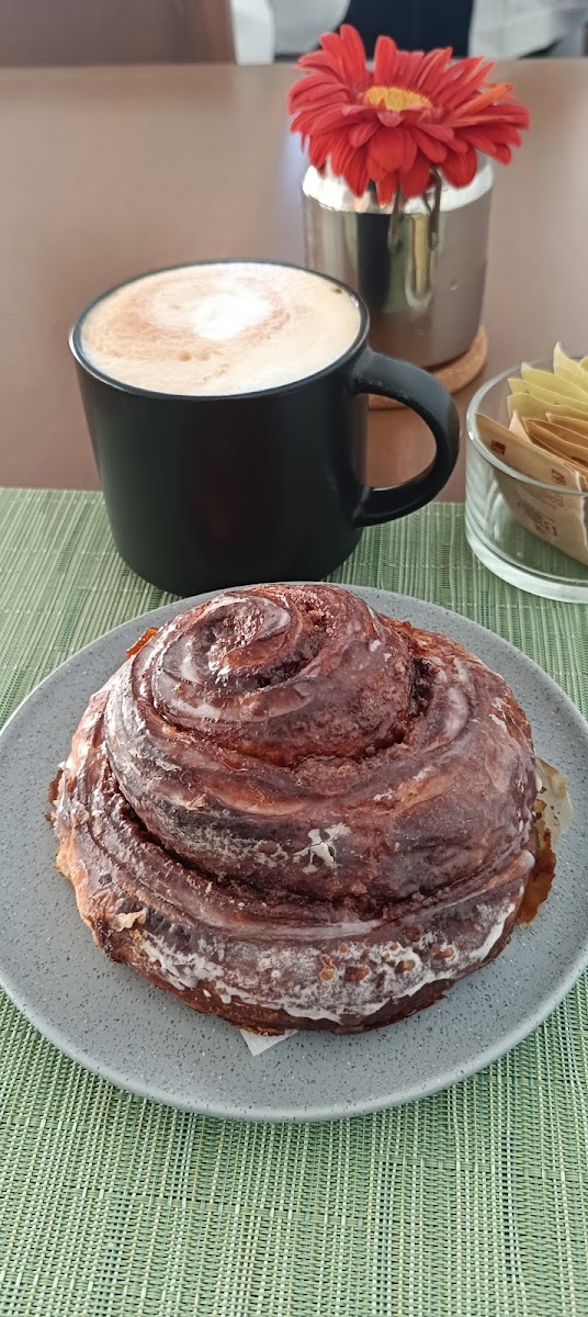 Good coffee and pastry stop. Two drinks, pastries, tip about mxn $400. Two of us shared a cinnamon bun and a chocolatin. Both were huge.