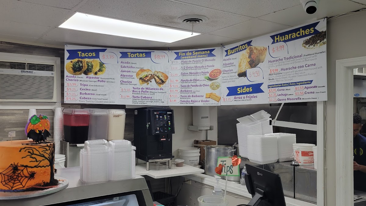 Sope de asada o alpastor. Thick corn tortilla with beans, steak or seasoned pork, lettuce, sour cream topped with green or red sauce