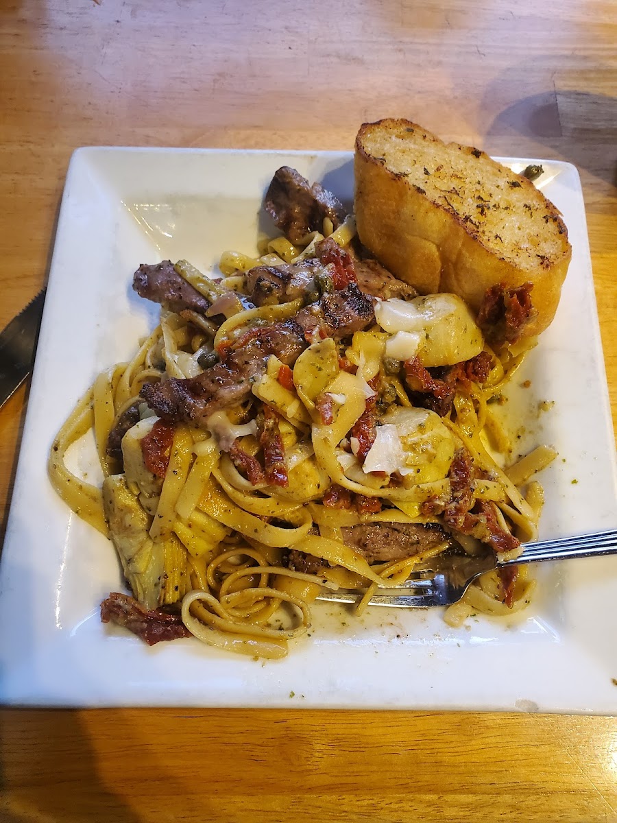So many great choices! Finally ordered the shrimp scampi. Wasn’t as flavorful as I expected. Pretty bland. My husband ordered the all meat calzone with a few extras and really loved it! Server made me a skinny margarita, which was excellent. Garlic toast was awesome. Overall, really a good place to eat!!!