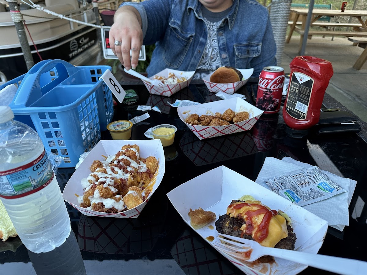 Very cool little spot to get some bar food and sit by the water. The service was top notch. Only complaint was the fryer oil was definitely in need of being changed, our tater tots were not great. The bacon was perfect on the burger but they used store bought chewy bacon bits on the loaded tots…please just use real crunchy bacon. So much better. The wings were probably our favorite, they were very good!