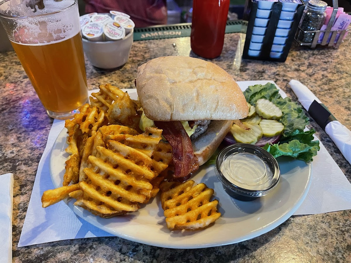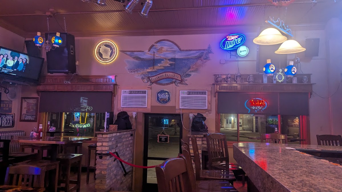 First time here. Stopped in after riding bikes on the Glacial Drumlin Trail. We came at noon. The place was empty except of a group of people at the bar. For a bar/grill there was plenty of light through the front windows. The place was relatively spacious, and well cared for. Lots of video poker games, if you are in to that. (Nobody playing, so it wasn't a distraction) Got seated right away with menus. We got our waters and soft drinks right away. We ordered a couple broasted chickens, and a Bacon Cheese Burger with Onion Rings. The food took a little bit of time to come out, but when it did it was all fresh, hot, and tasty. The broasted chicken was crisper, and well seasoned. Plenty of sides to go with it. The Burger was good too, but over-cooked (I asked for medium - rare). Generous amounts of bacon, and plenty of onion rings. Would come back again.