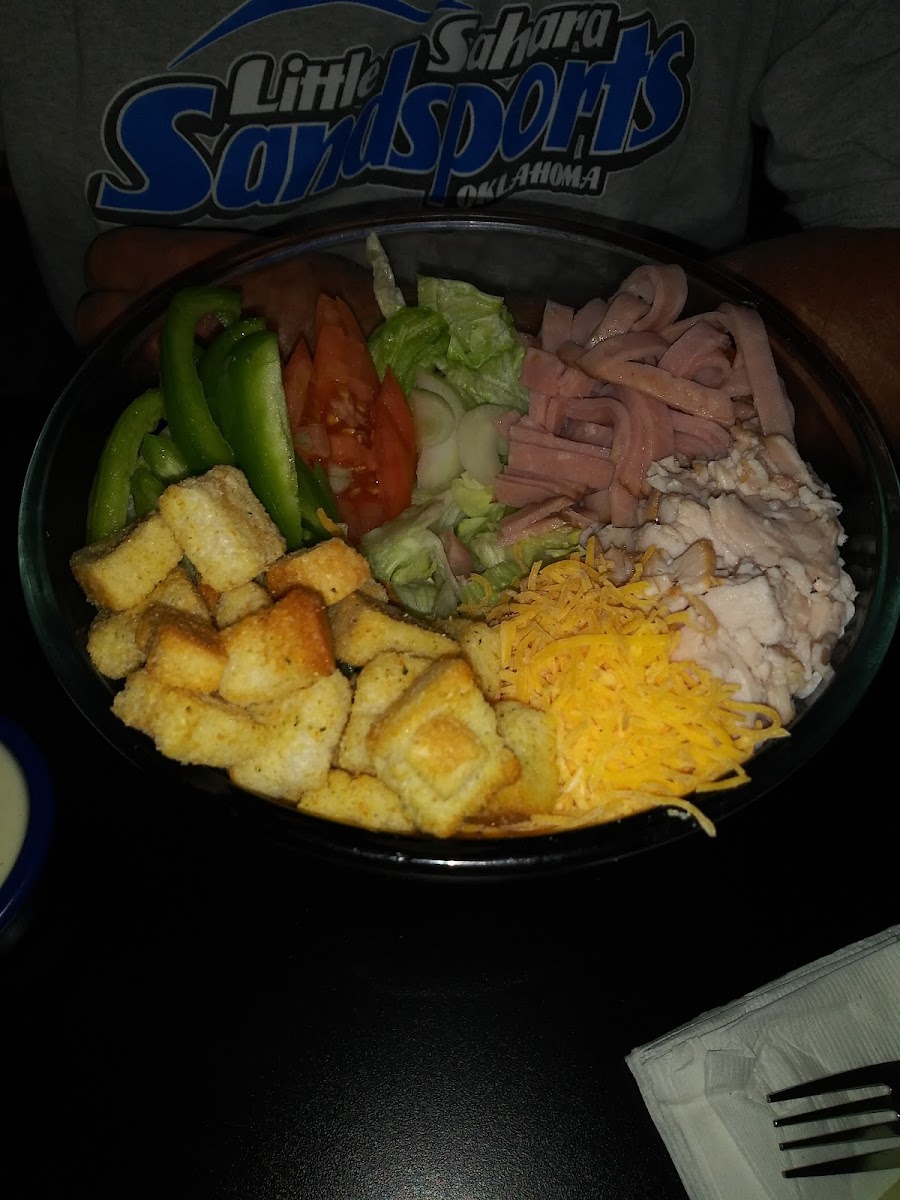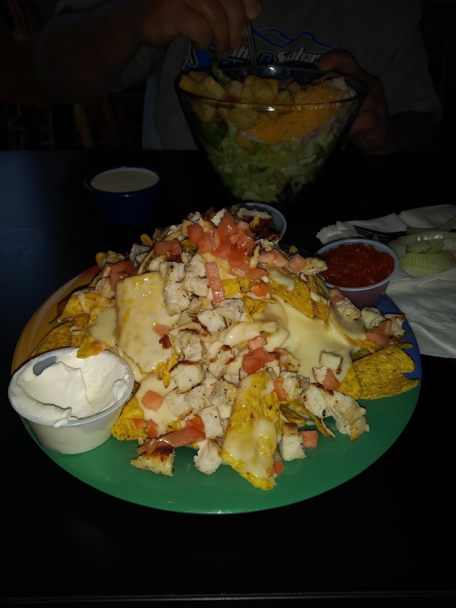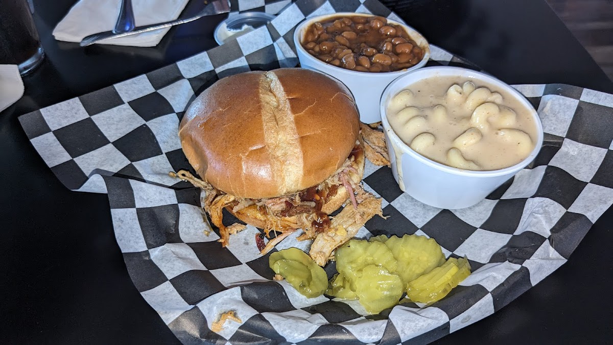 We were there for a late lunch. Very tasty pulled pork sandwich served on a substantial toasted bun. Generous side portion of smoked mac & cheese made with hefty cavatappi pasta. Very delicious! The grilled chicked salad was quite large with a good balance of meat and greens. It was served in a mixing bowl. Cruncy croutons on top. The tea was very weak, but the beer was perfectly chilled. Be certain to ask about daily specials because we overlooked them as it was our first visit. This is a bar, but it is clean and bright. They have a big patio at the front of the building for outside dining. The restroom was clean and tidy.