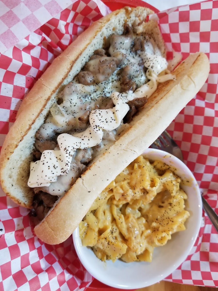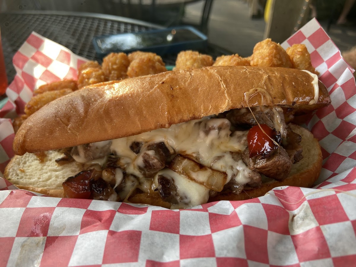 Lunch was good. Philly steak on a soft bun and lots of melty cheese..yummy. Had these and cheese side..eh. But the prize goes to the fried pepper appetizer. So good! Service was outstanding. I wish I had remembered to buy a tshirt and next time we will sit outside. Looks amazing.