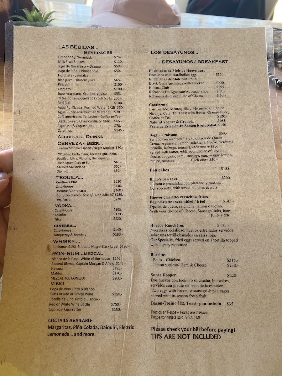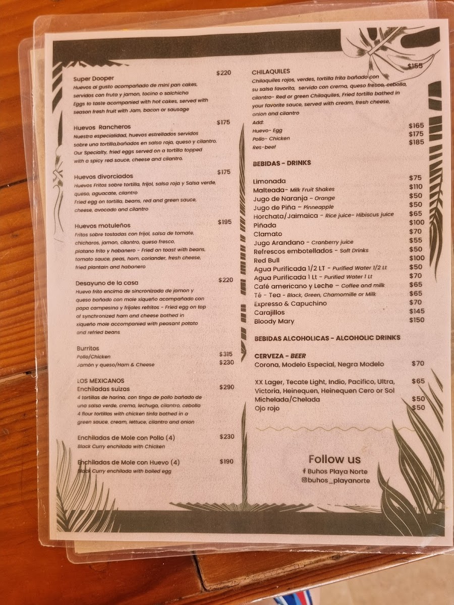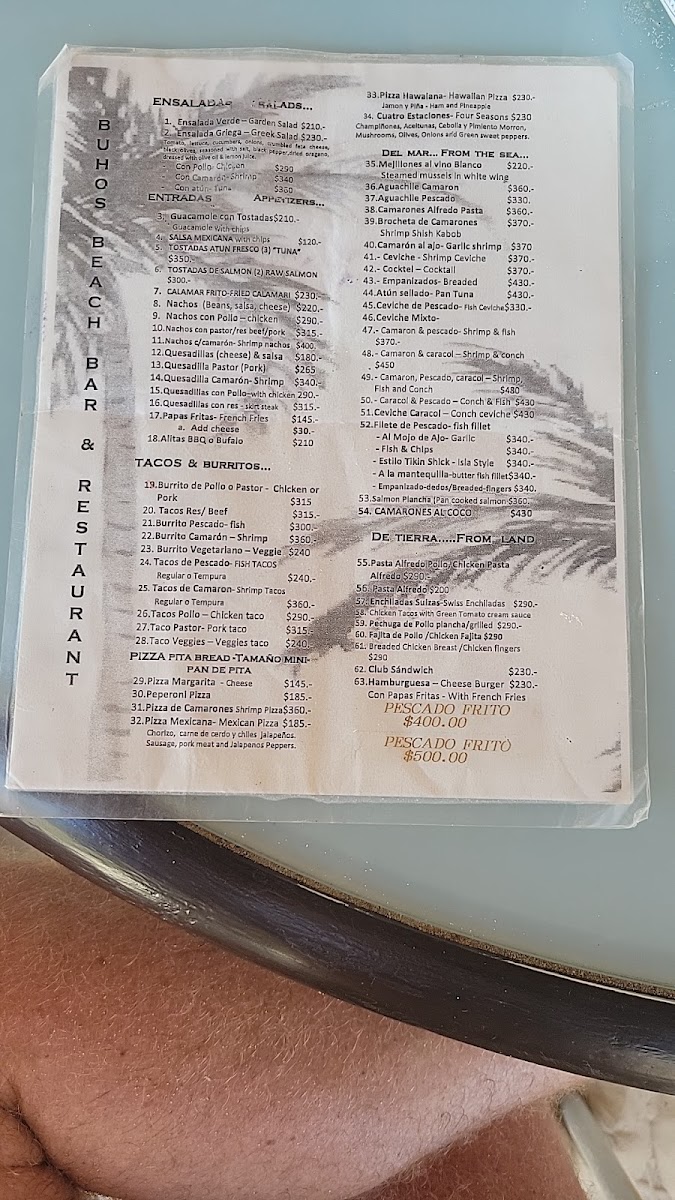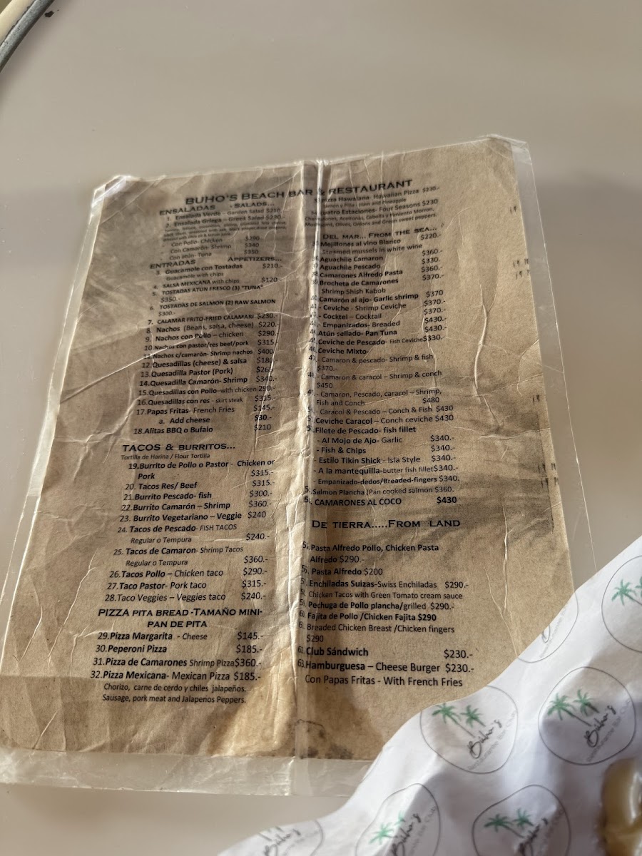 Buho’S Beach Bar & Restaurant Menu