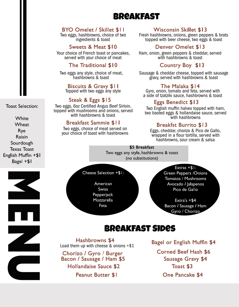 Fresh hashbrowns, onions, green peppers & brats topped with beer cheese, two eggs & toast