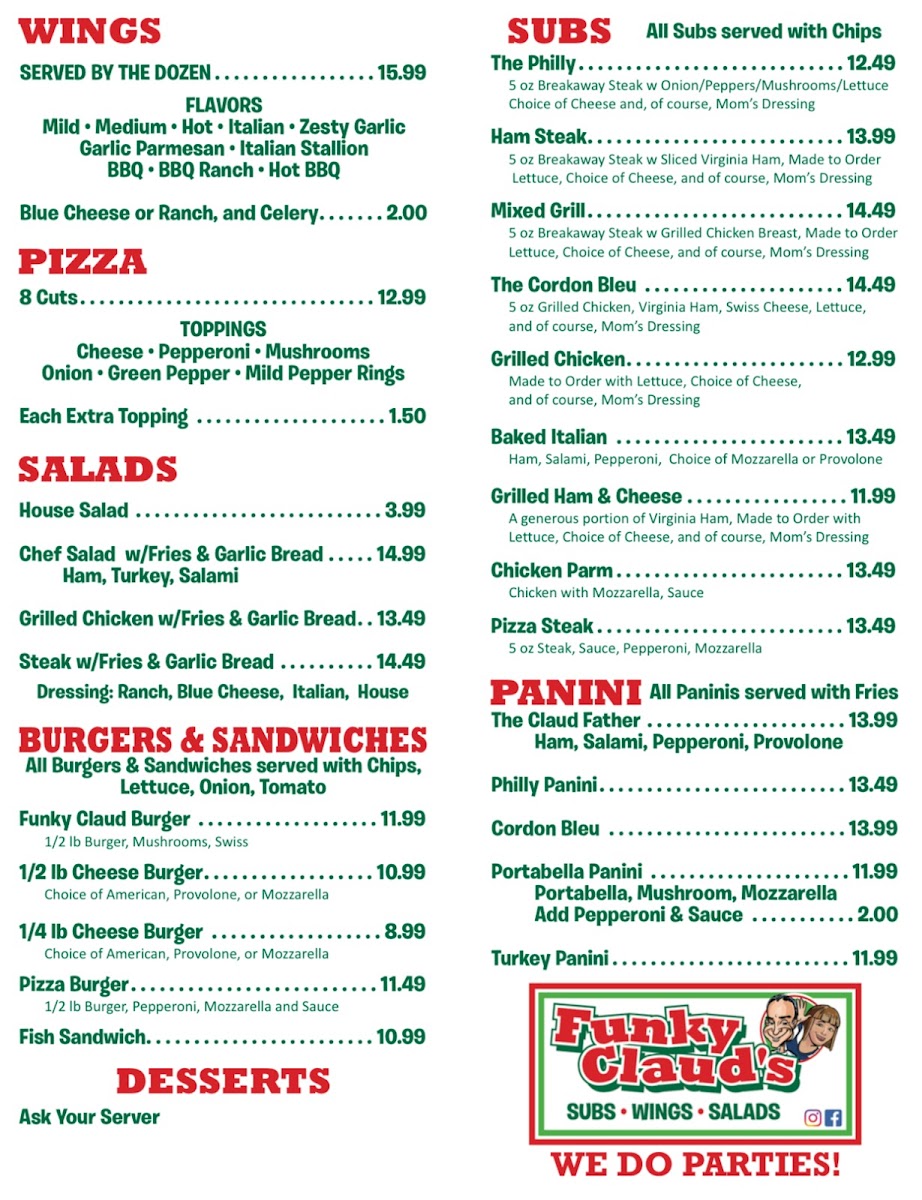 Small…..$2.99 Large…..$3.99 add Cheese…..$1.50 add Chili…..$2.50