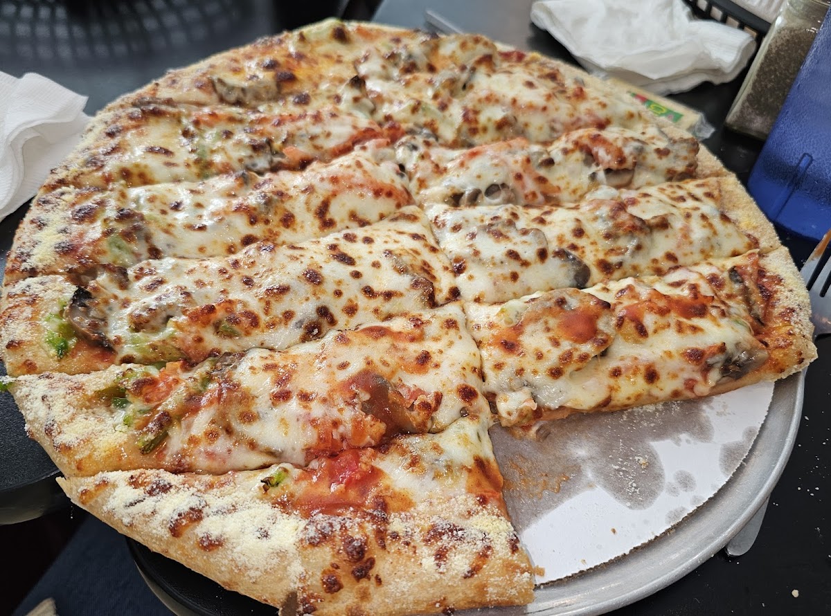 This place has some of the best pizza ever. Crust is salty and sweet amazing sauce, can’t say enough great things about it love the small town atmosphere and service is pretty good considering they’re generally really busy.