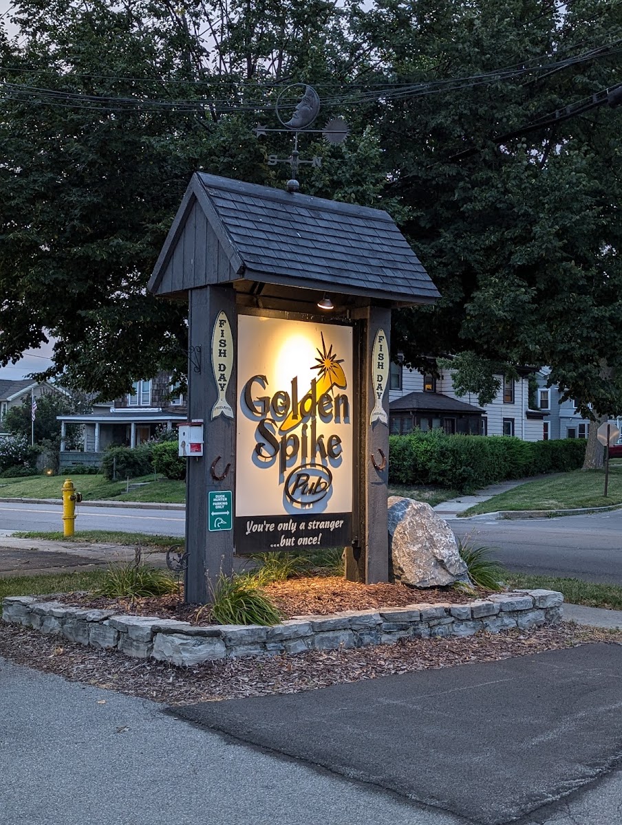 Golden Spike Pub at 411 W Manlius St, East Syracuse, NY 13057, United States is a bar & grill with 517 user reviews. Their menu features customer favorites including Chicken Fingers and Fries, Fried Cheese Curds, Chicken Quesadilla, Chicken and Waffle Sandwich with Sweet Potato Waffle Fries, and Deep Fried Haddock Dinner with Fries and Macaroni Cheese. The total number of menu dishes is not mentioned.
