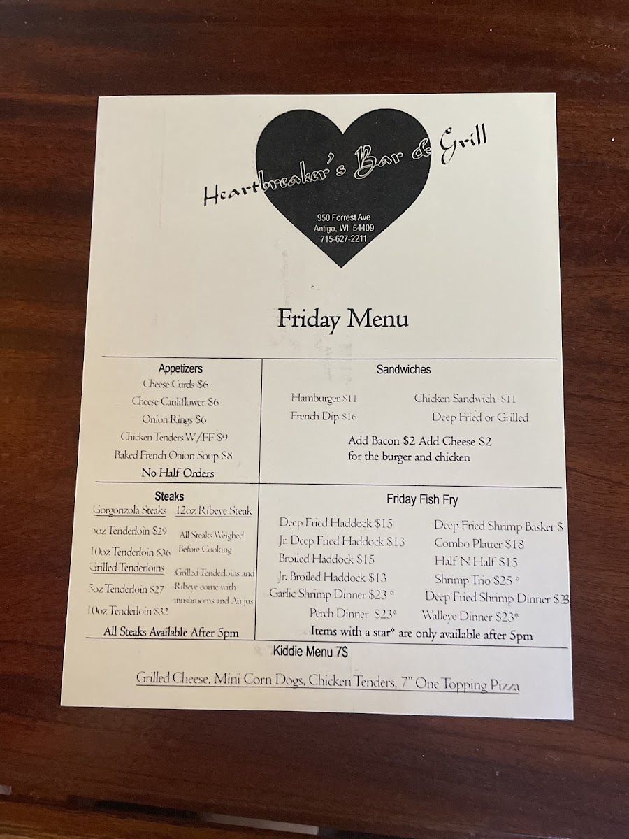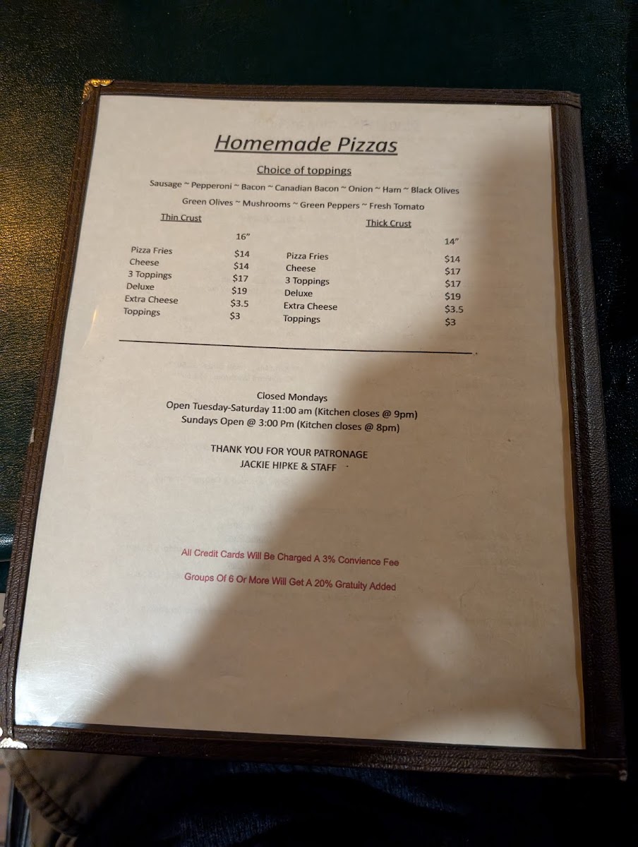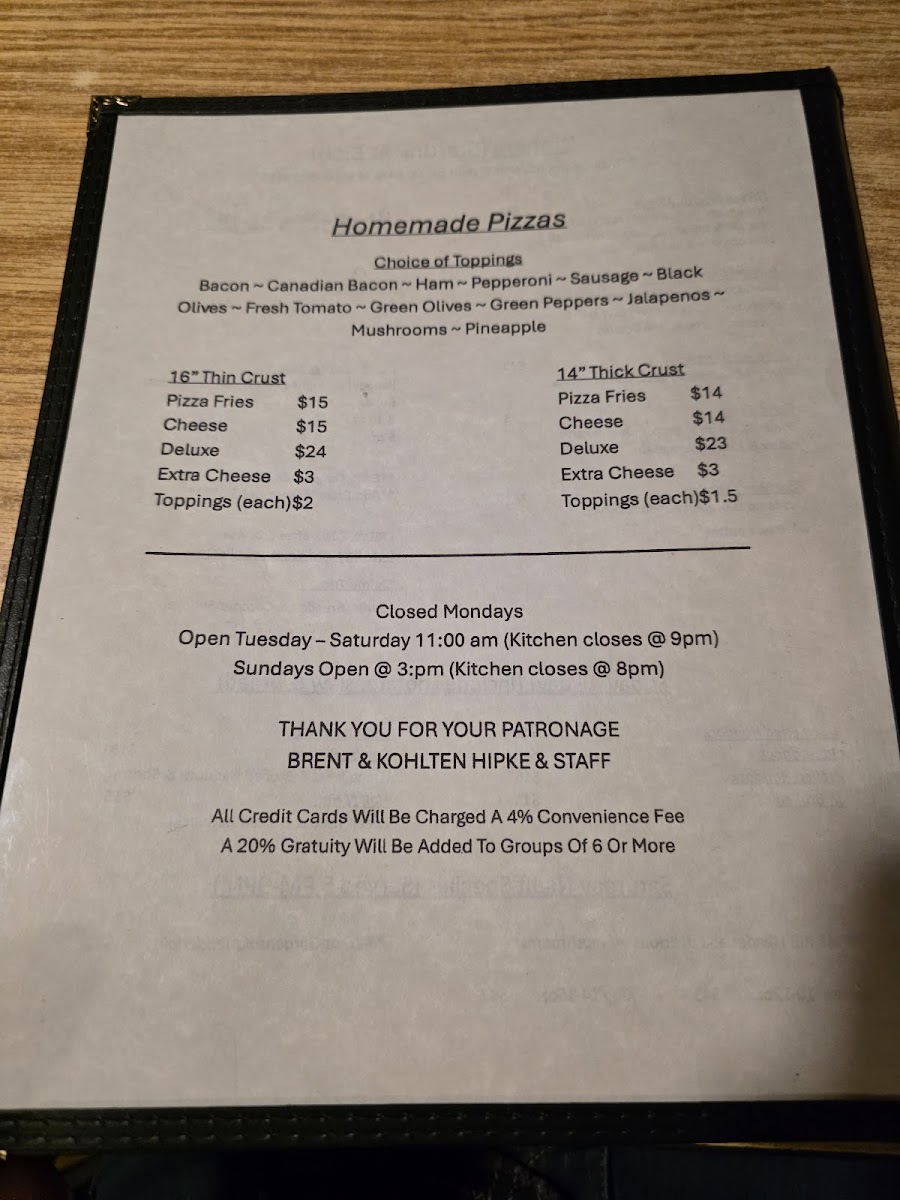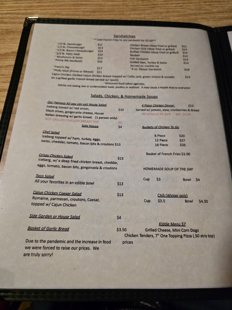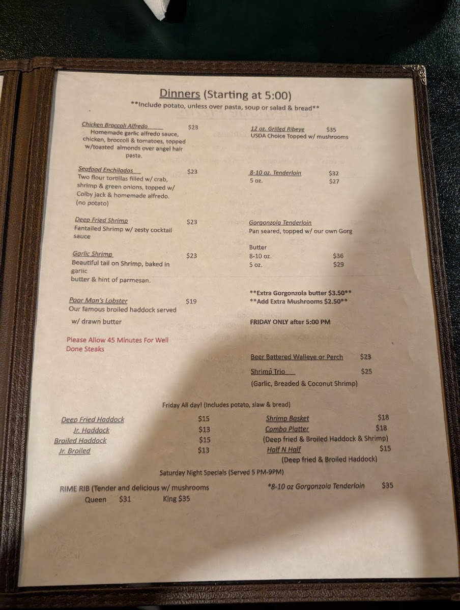 Dinners (starting at 5:00pm) includes potato and soup or salad
