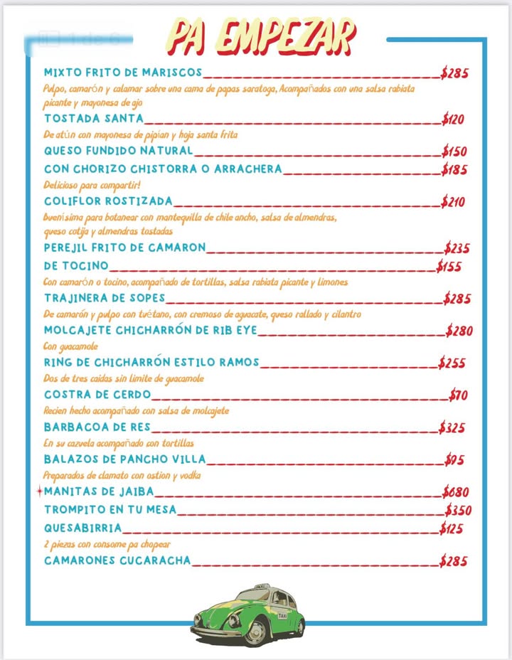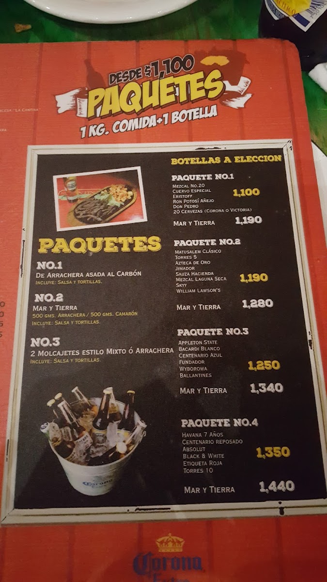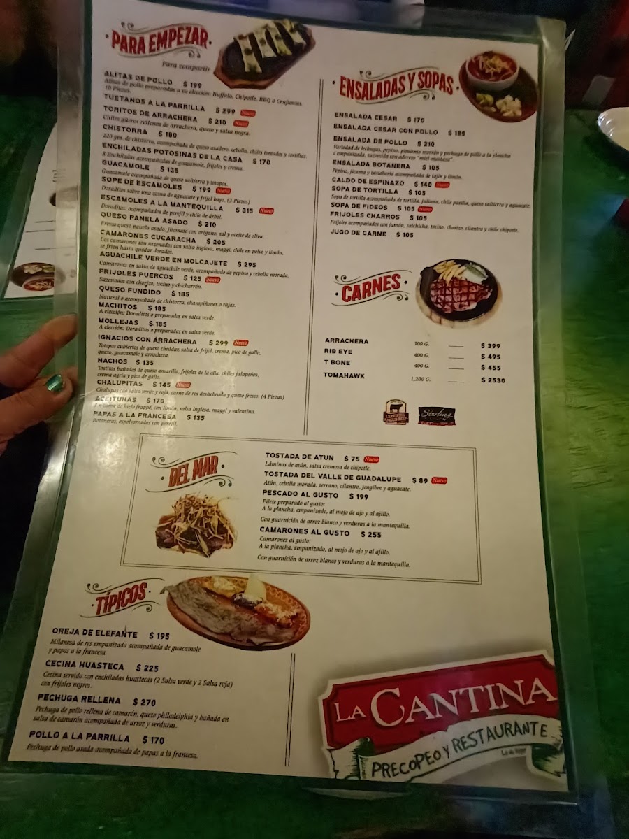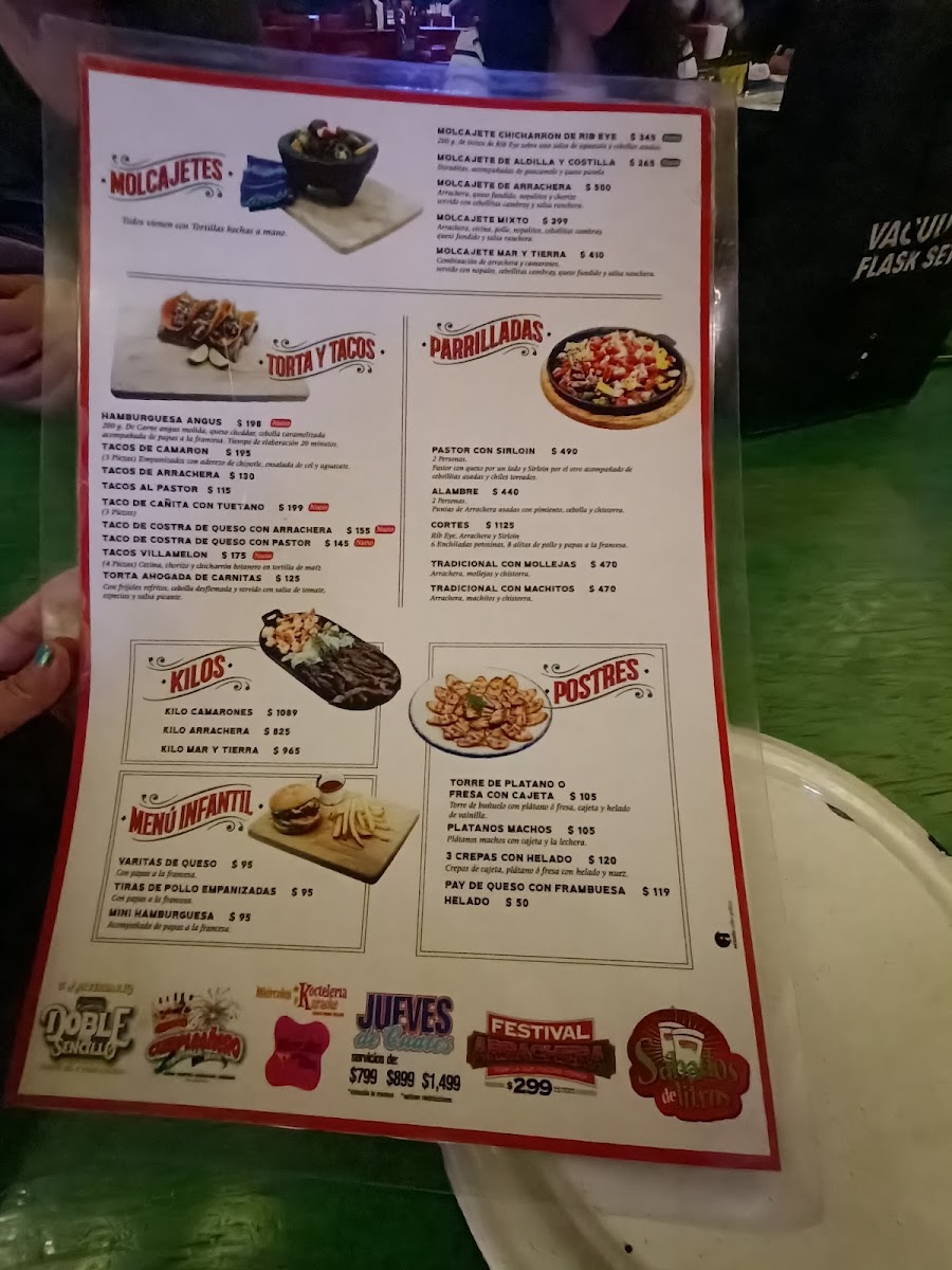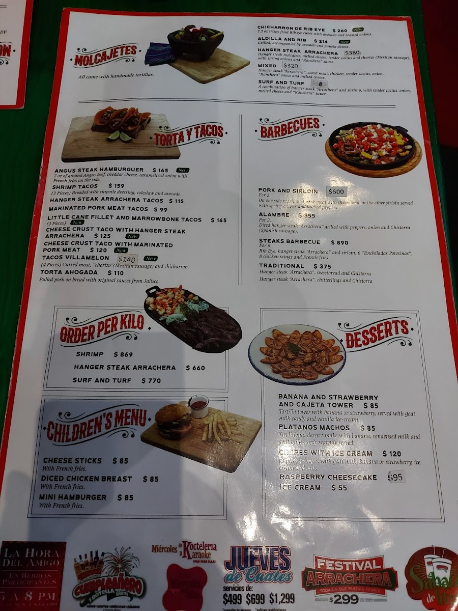 Arrachera, cecina, pollo, nopalitos, cebollitas cambray, queso fundido y salsa ranchera.