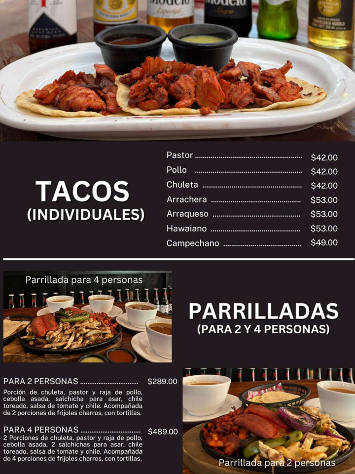2 Porciones de chuleta, pastor y raja de pollo, cebolla asada, 2 salchichas para asar, chile toreado, salsa de tomate y chile. Acompañada de 4 porciones de frijoles charros, con tortillas.