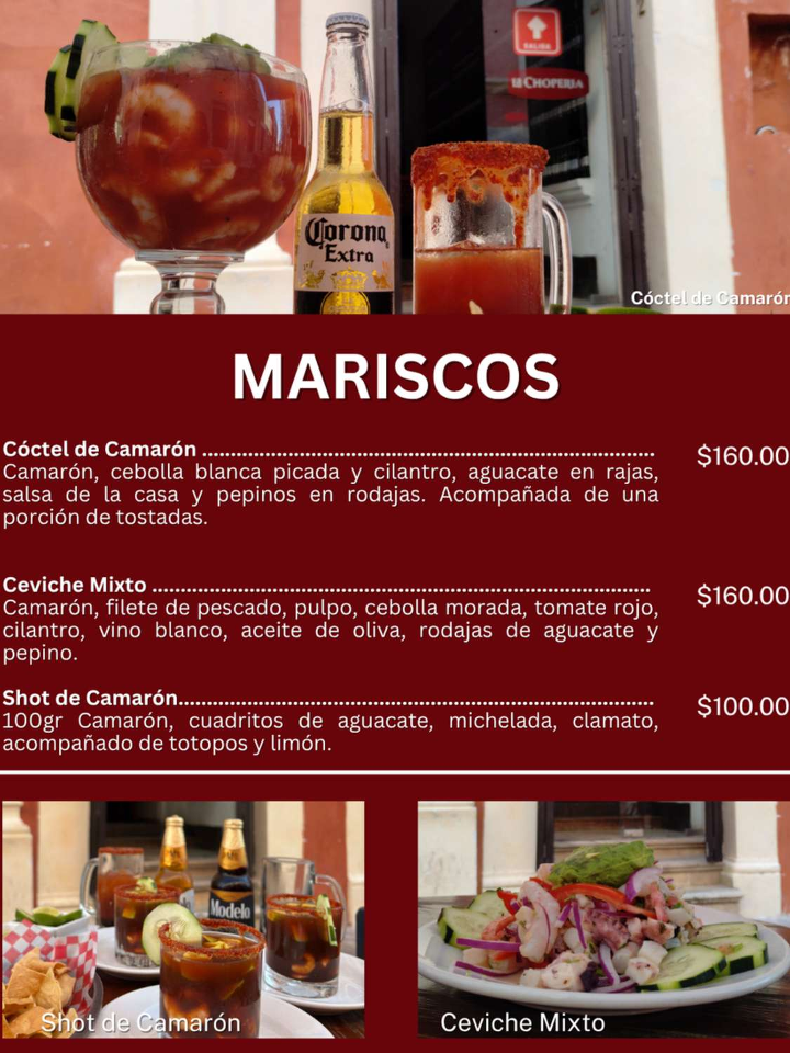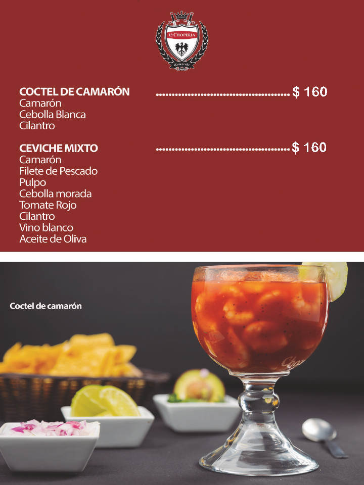 Camarón, cebolla blanca picada y cilantro, aguacate en rajas, salsa de la casa y pepinos en rodajas. Acompañada de una porción de tostadas.
