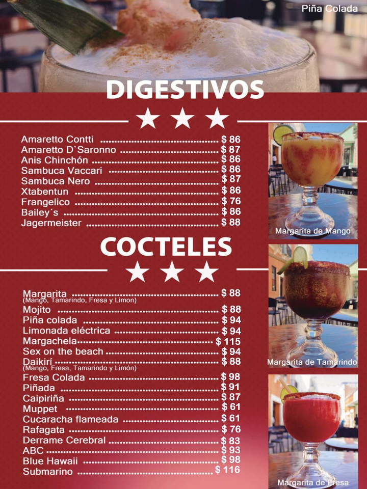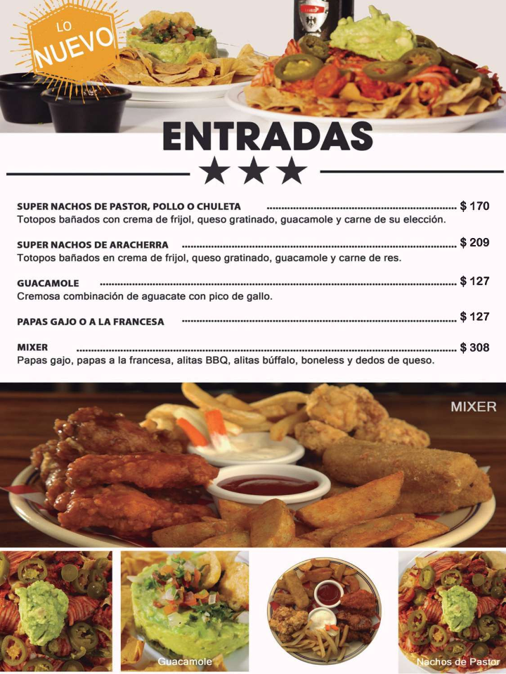 Papas gajo, papas a la francesa, alitas BBQ, alitas búffalo, boneless y dedos de queso.