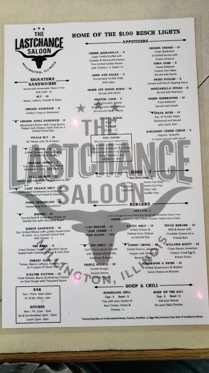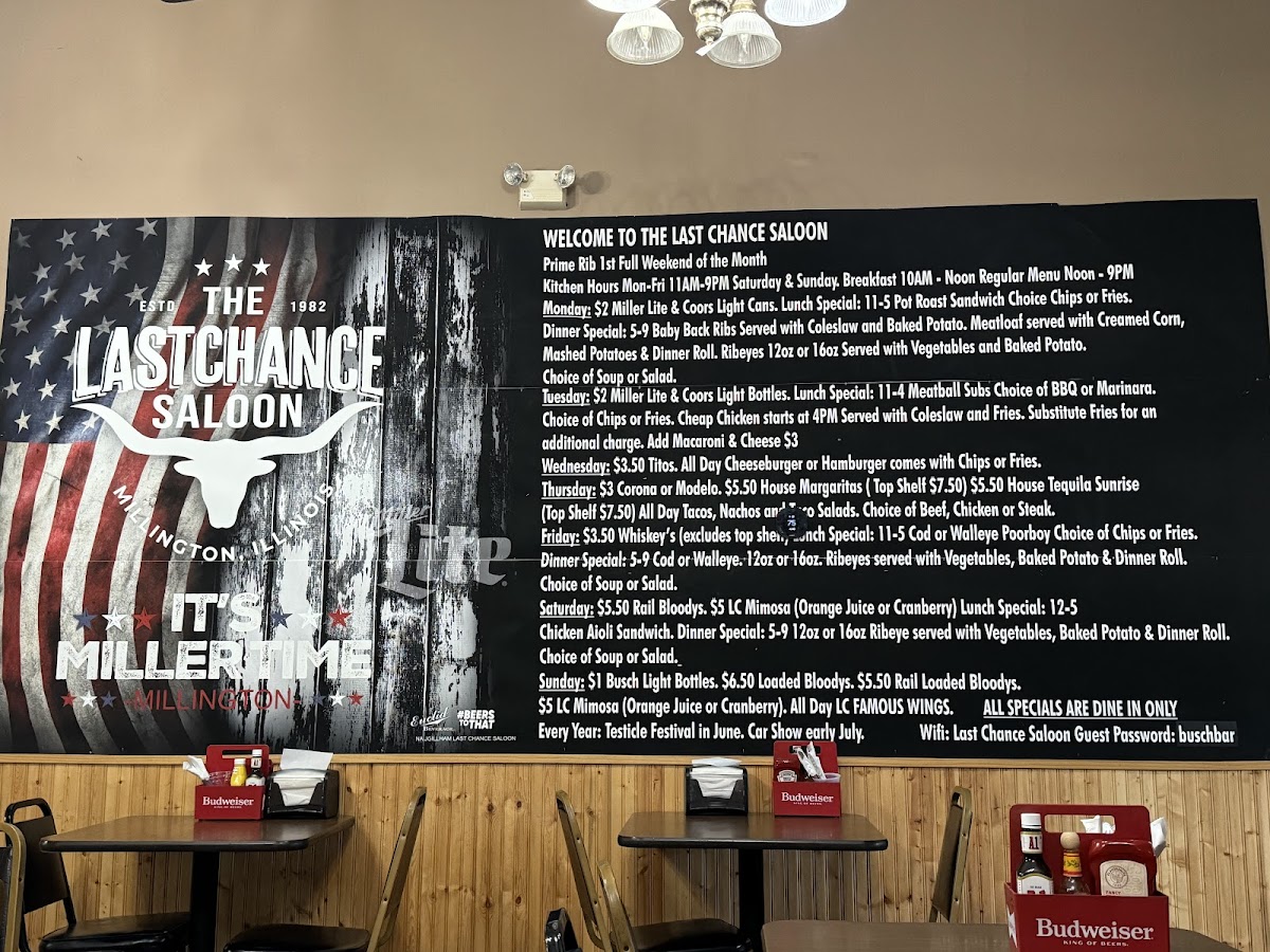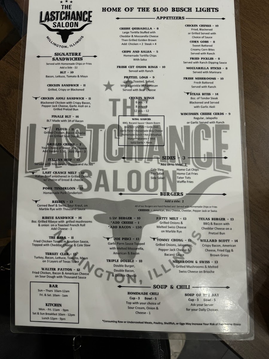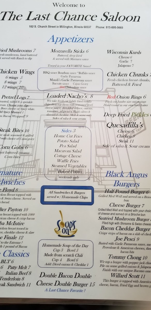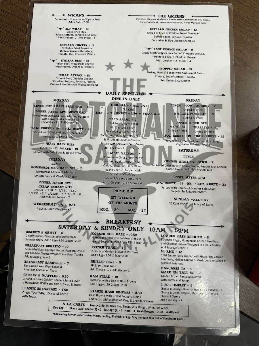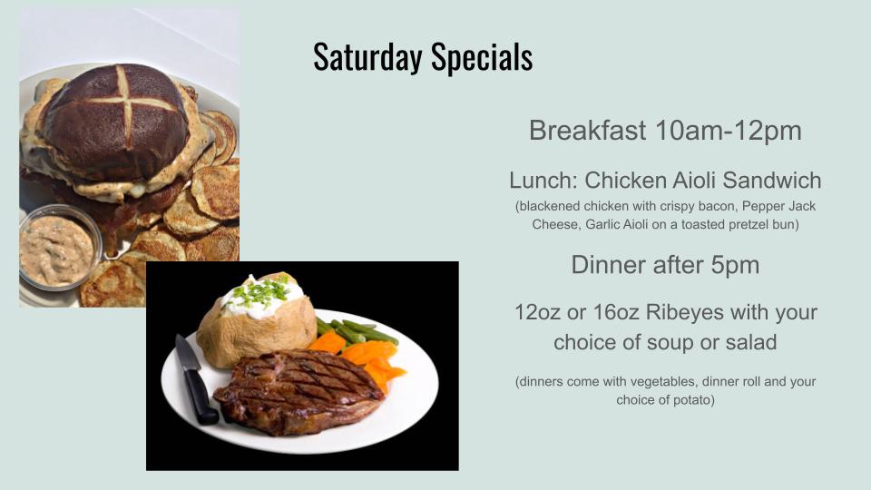 Lunch pot roast sandwich Dinner meatloaf after 5PM Ribeye dinner after 5PM