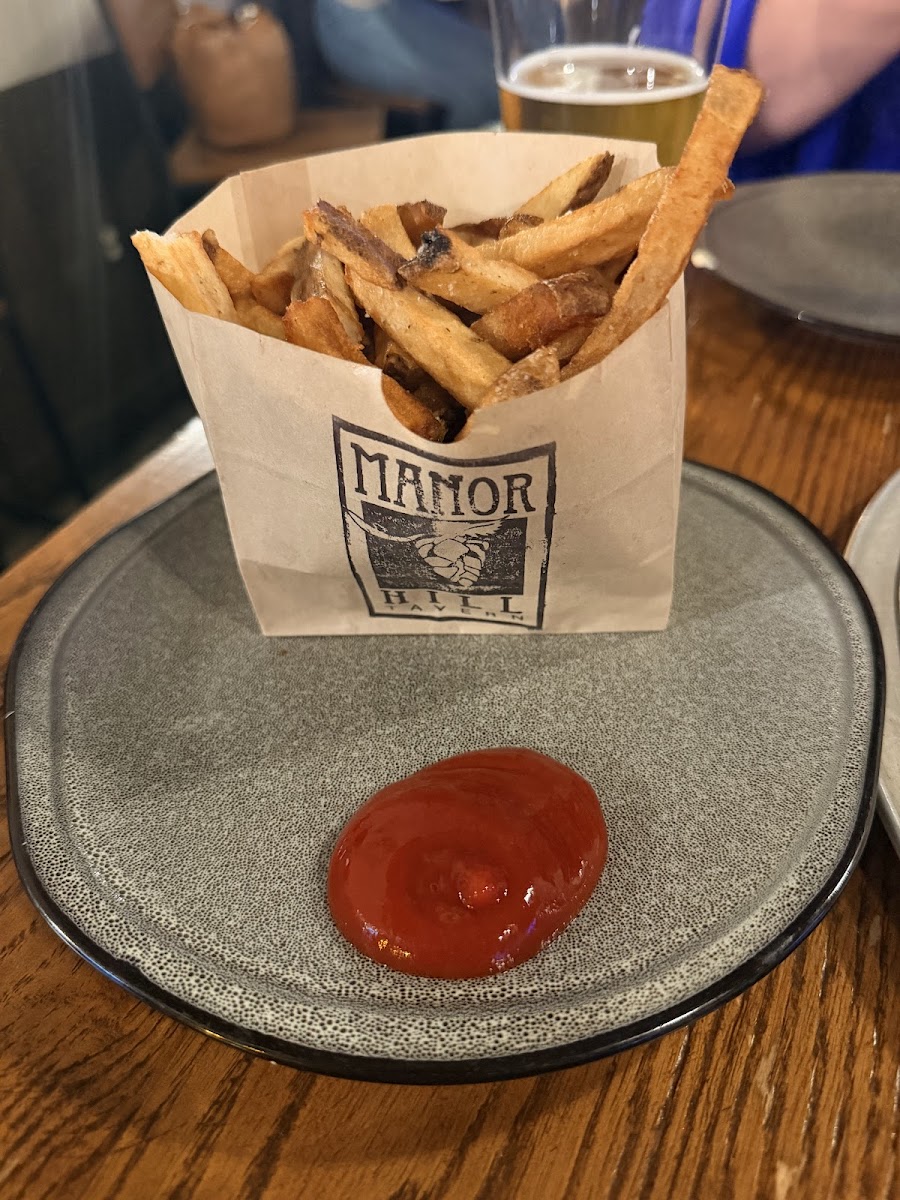 Manor Hill Tavern has a good menu with a variety of flavorful dishes to satisfy almost any palate. I had there burger which was really food. The meat had flavor and the burger was well cooked but still tender. The caramelized onion spread and cheese were a great combination so that no other condiments were needed. The side orders of bacon fries and cucumber salad, made the meal a comfort food dish with a hint of healthy eating. My drink was the prickly pear, a refreshing non-alcoholic drink. And a light orange Creamsicle desert capped a reasonably priced meal. The place has two outdoor venues that were cool and quiet. The service was good and friendly. Dishes that I saw on other tables looked equally good to what I had ordered, so I know I will return.