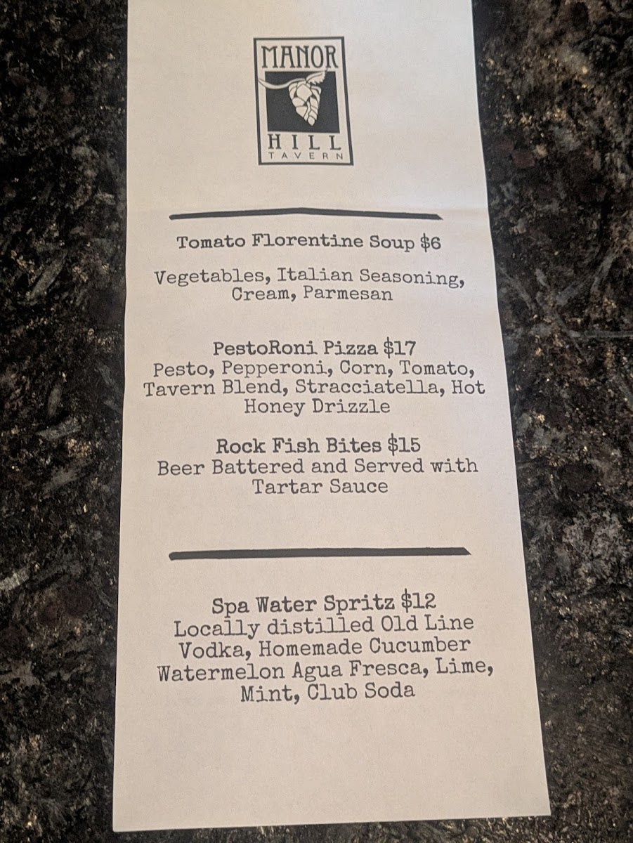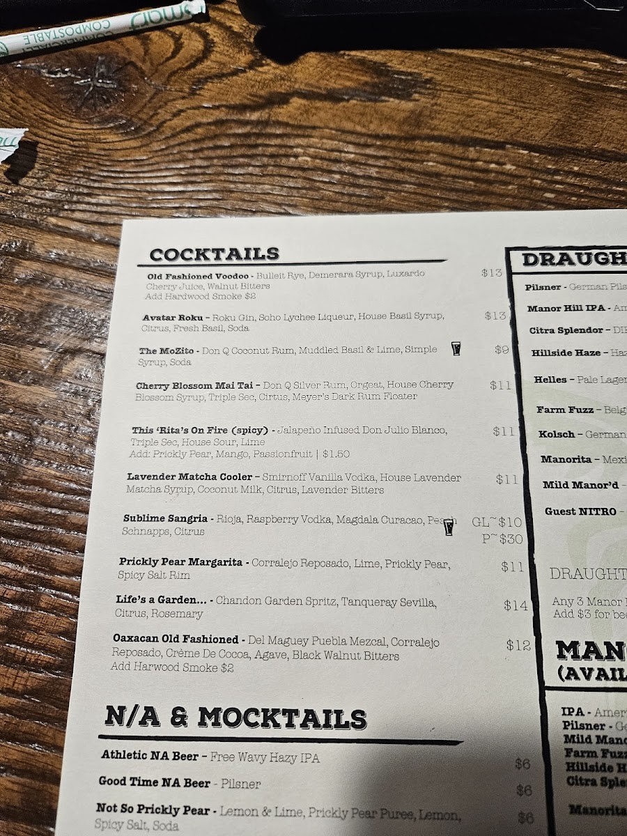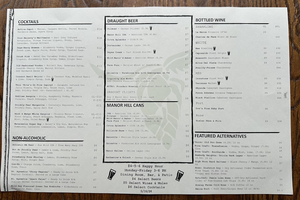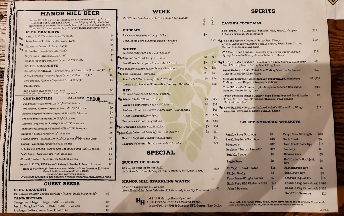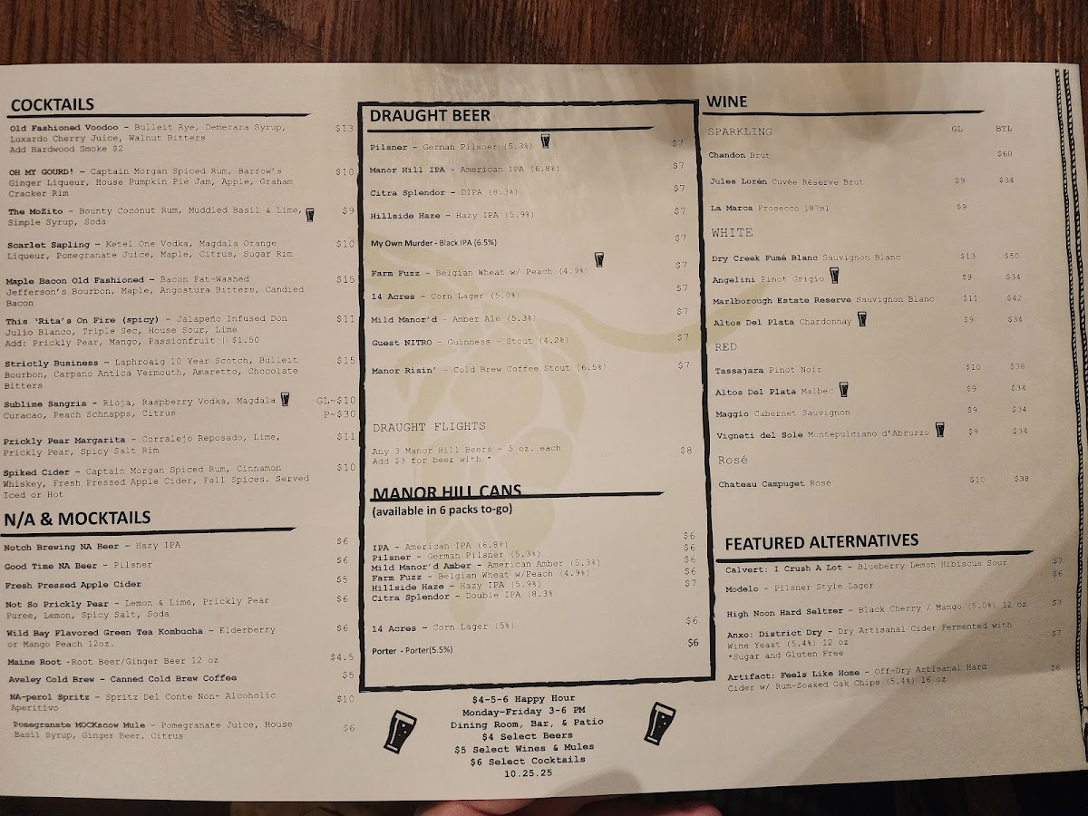 Manor Hill IPA, Citra Splendor, Hillside Haze, Farm Fuzz, Pilsner, Mild Manor'd Amber And Seasonal Selections Available