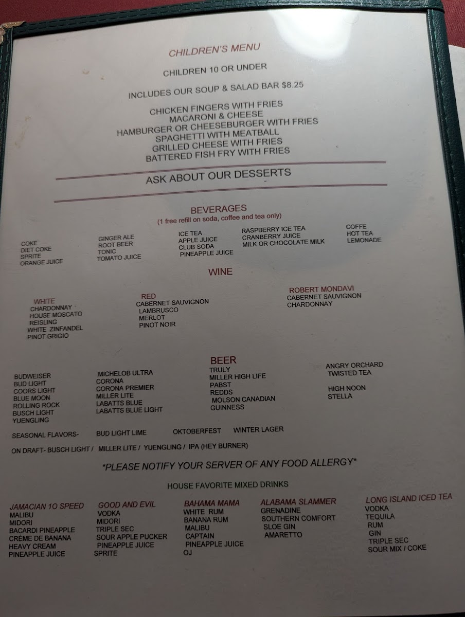 Great food. Love soup n salad bar as part of your dinner. 1st time in 20+ years I ordered a steak at a restaurant. It was delicious and loved the seasonings. I was surprised how quiet the dinning area was for a Saturday but figure it was because of HS graduations taking place. The bar area was inviting w a handful of folks. I was only there to get change to leave tip at table. Food prices reasonable. We will be back.