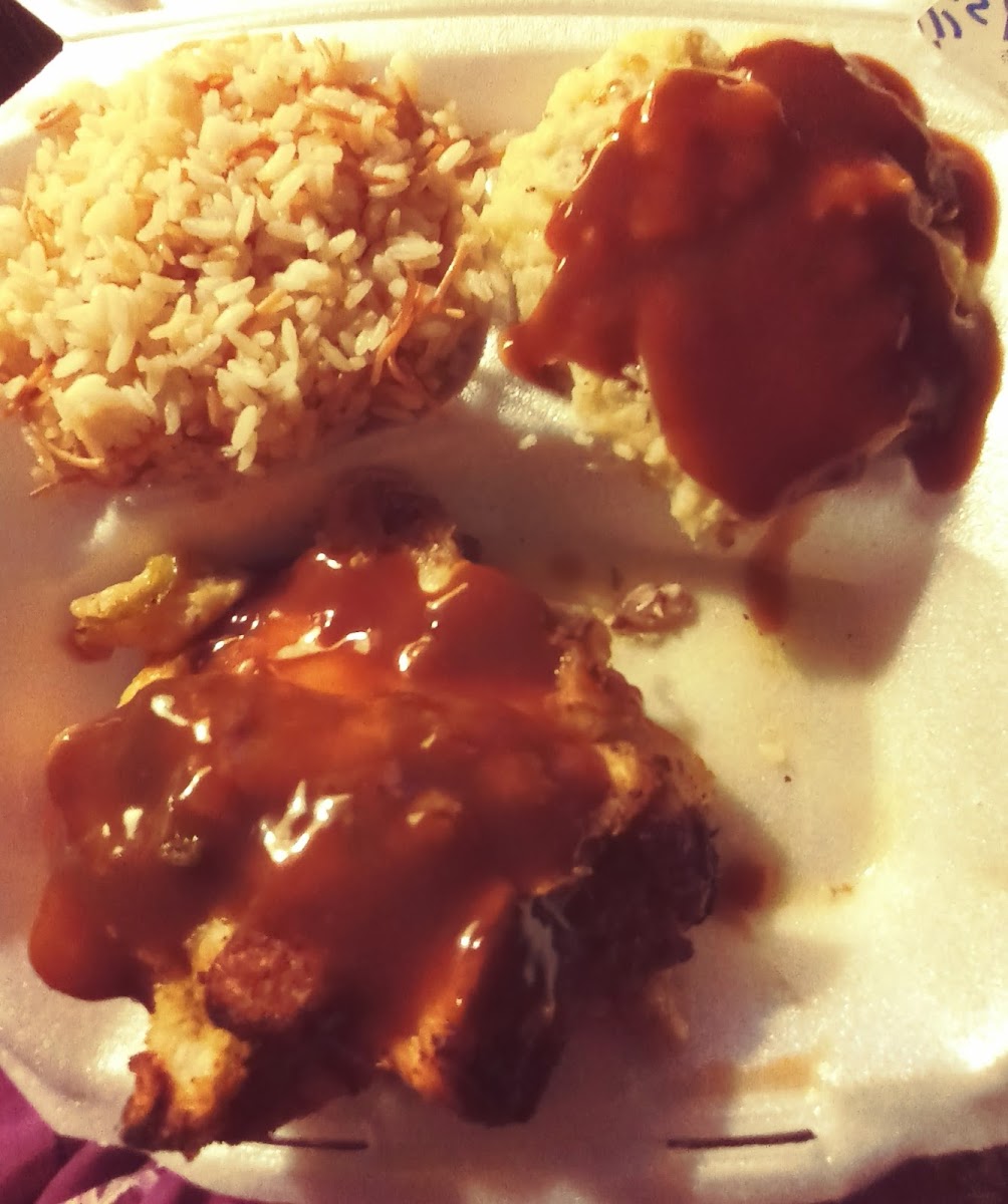 We had an awesomely delicious dinner from here last night. We ordered one of their Monday specials. They have specials every day as well as their regular menu. We ordered the Stuffed Chicken Breast which was so tender..filled with yummy home made dressing smothered in a delish gravy. We got this with divine home made mashed potatoes and rice pilaf. We also ordered a 1/2 slab of fall off the bone ribs with a superb sauce. Sooo good. These we got with skinny fair style fries and rice pilaf. Last but not least some utterly delicious fried chicken. Again the chicken was so tender and the coating awesome! We got that with Jo Jo's and rice pilaf. It is so mych fun to find a hidden gem like Ross'.