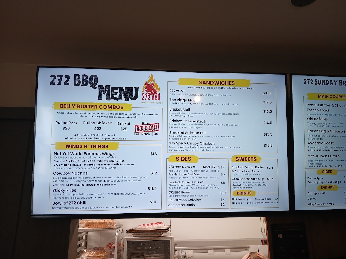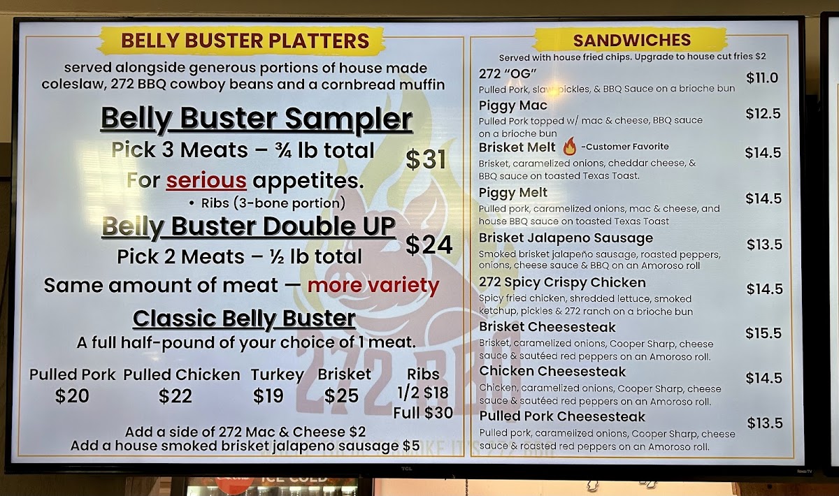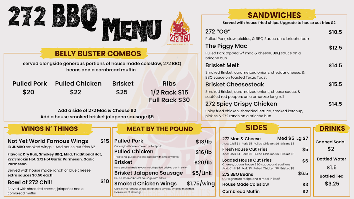 8 oz meat portion along with generous portions of our house cole slaw and our 272 BBQ beans (Add side of 272 Mac and Cheese $2)