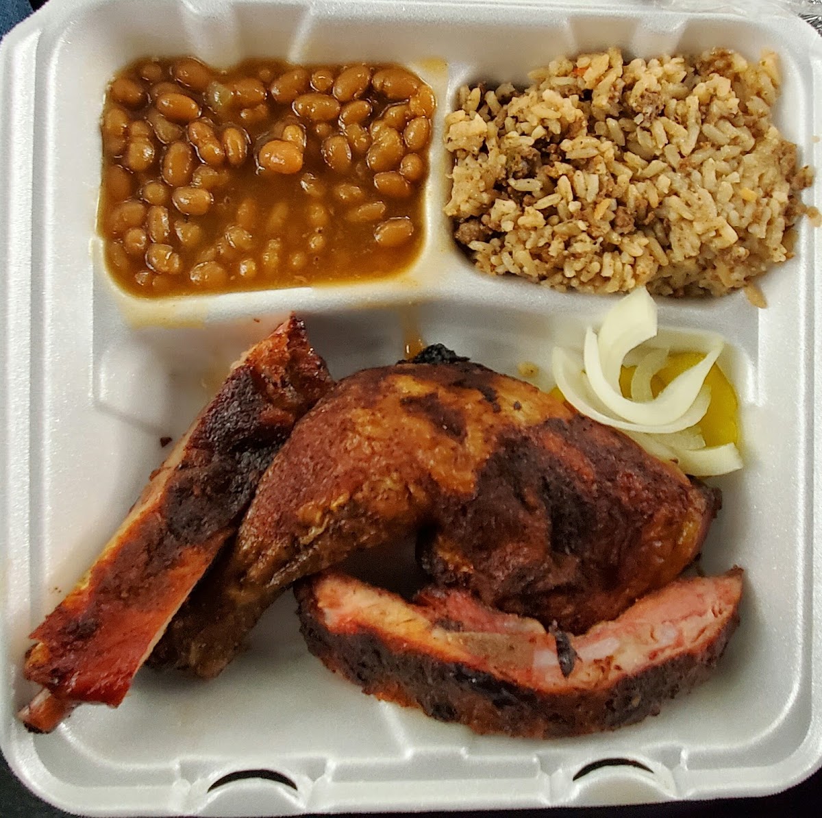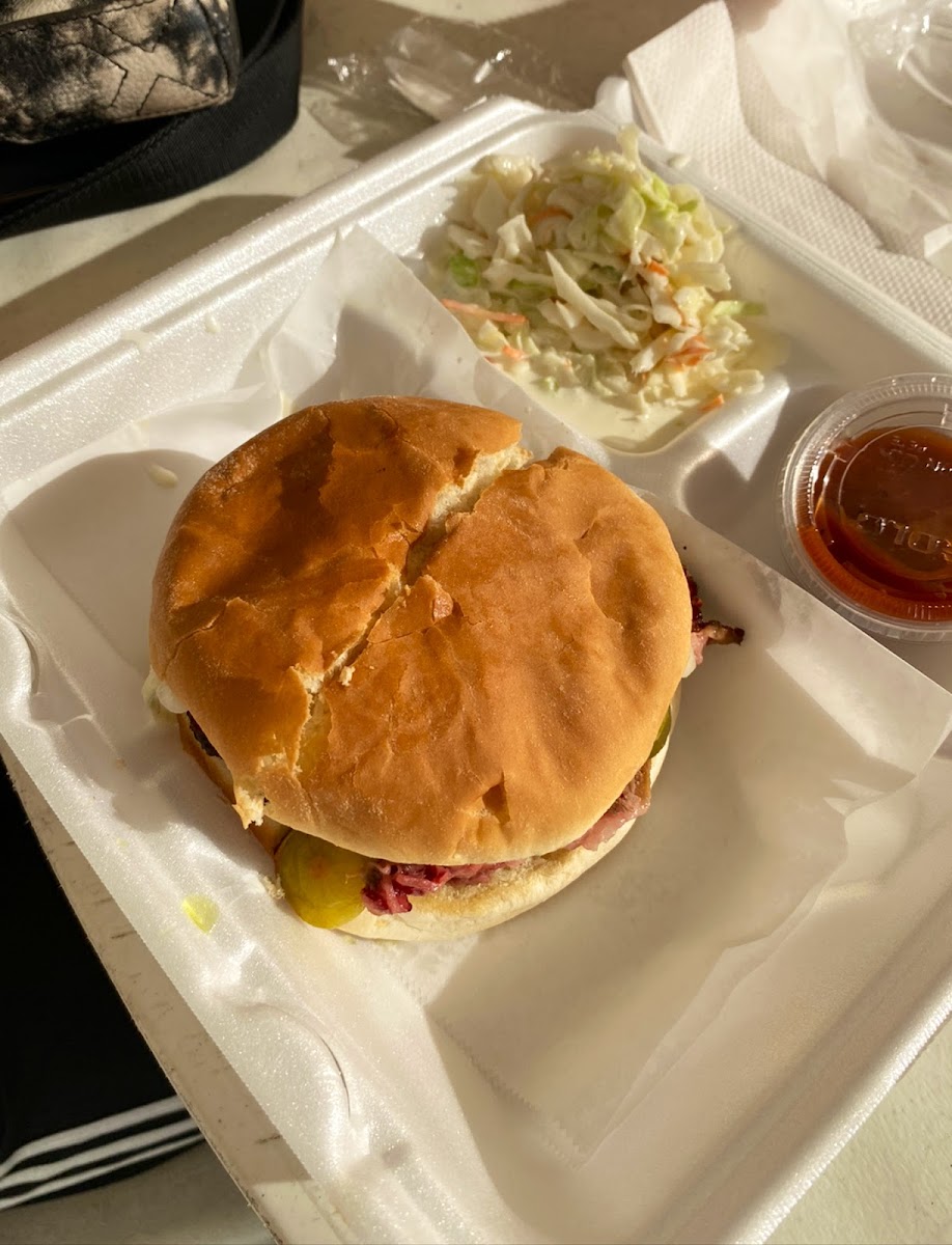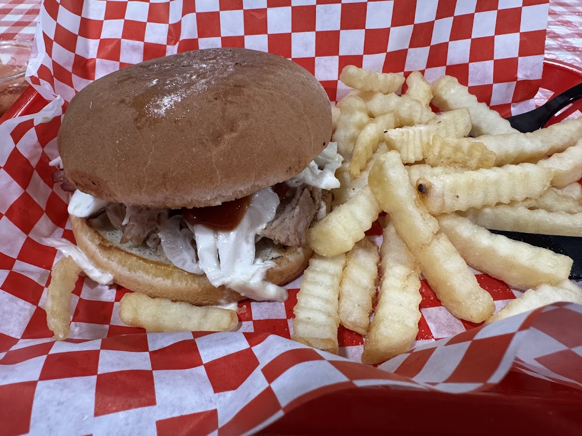 Brisket sandwich was very good with potato salad as the side ( I personally don’t like coleslaw, but I enjoyed it in the sandwich) They have a small seating area, with huge tables to order all the food you want, big fans on for the heat, and a radio playing music! I loved the whole atmosphere! And of course clean well kept bathrooms ! Was just passing through town, I would recommend. The family was so nice and welcoming I really recommend you come give it a try! Thank you, my family and I hope to visit again.