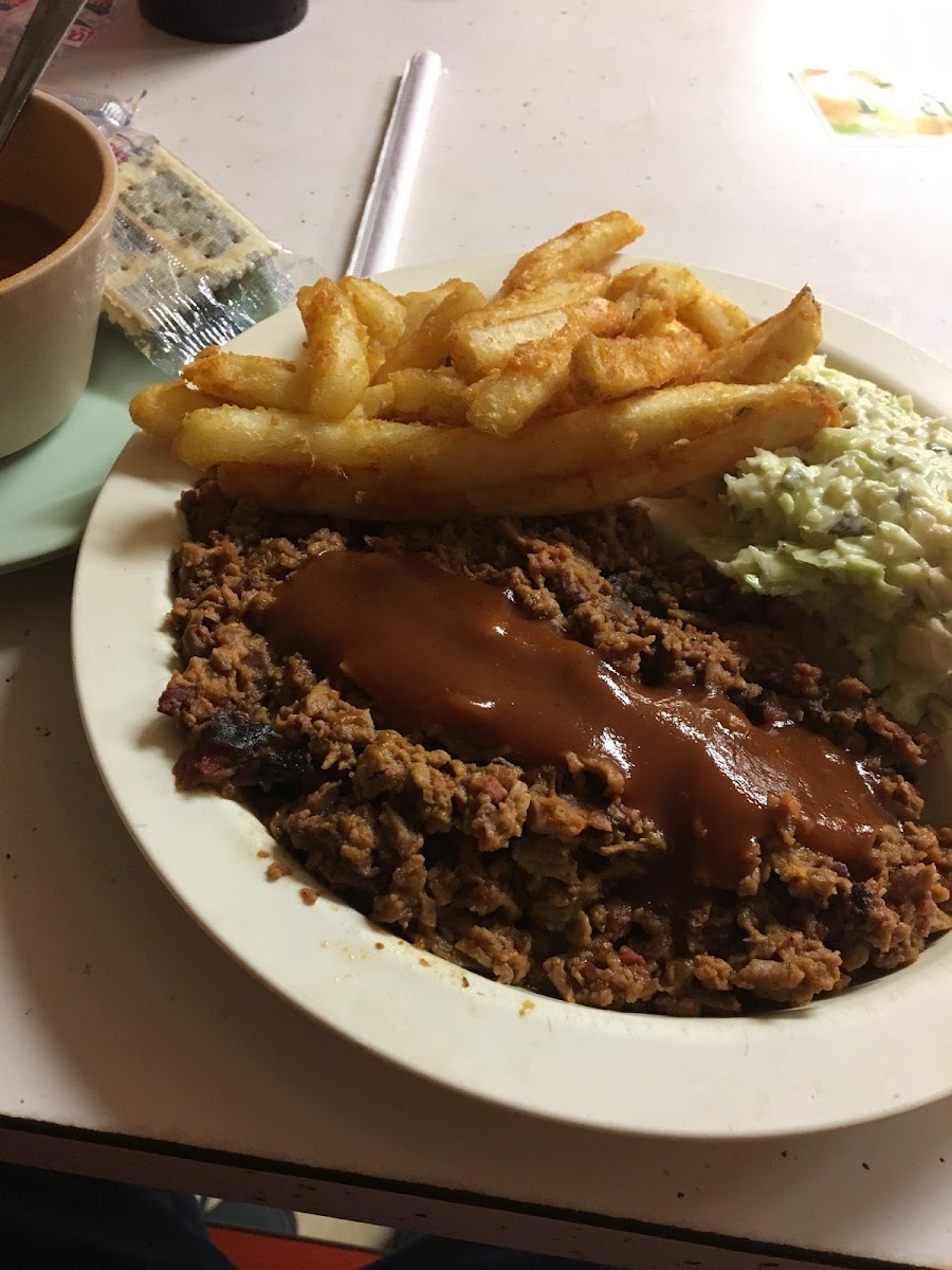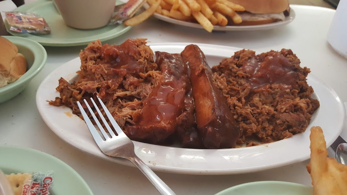 Good BBQ... Wife had ribs, fries and Cole slaw. I had the shredded pork sandwich on toasted bun with baked beans and fries. Slaw and bake beans sides made on site...very tasty. Meat was very good. You will like. Our server Kristen was polite and very attentive. Very good 1st visit. This place has been here a long time. Recommend if you like BBQ...