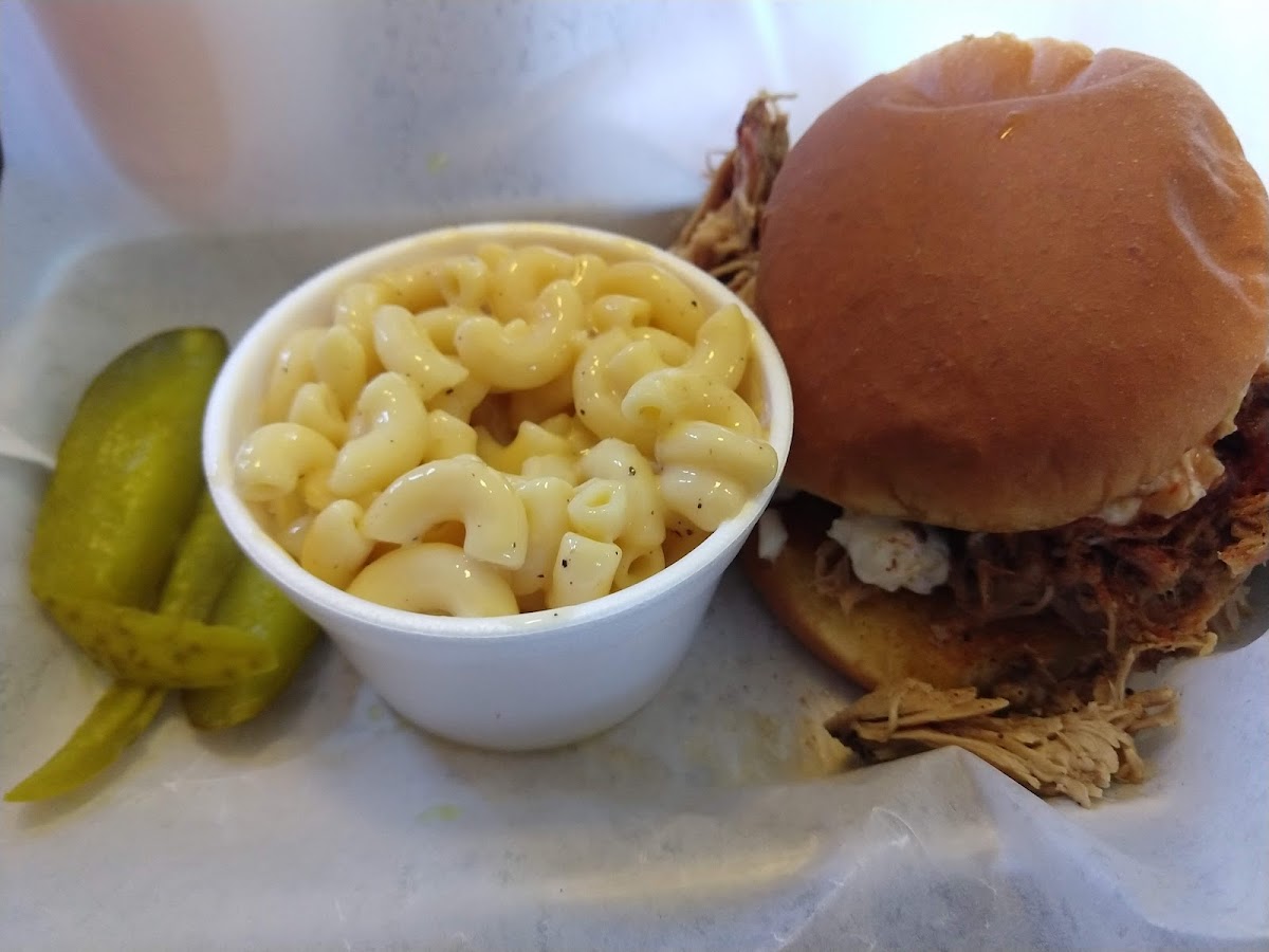 Nice home town BBQ. Staff was friendly and easily ordered at the counter for 1st time customer. Had the fat back sandwich. BBQ pork with slaw. Very good but a bit soggy bottom bun. Mac and cheese was well seasoned. Fair price. Pickle spear could be better. Overall nice place. Will be back to try more.