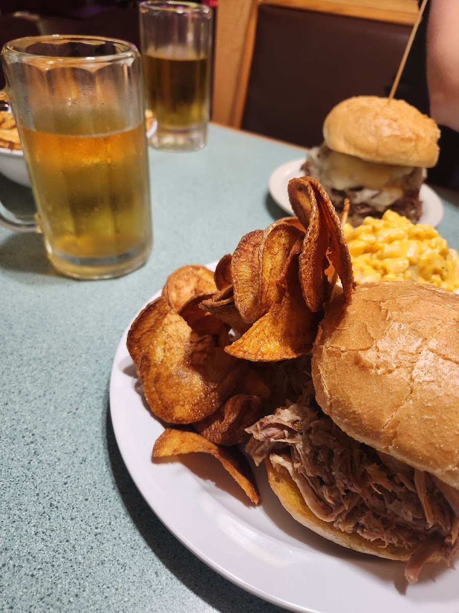 Very friendly and efficient staff. Informal vibe. We had excellent brisket, roast beef, fish sandwiches, piles of great hand-cut fries and baked beans. Their lager was unique and very good. Their rye whiskey to die for.