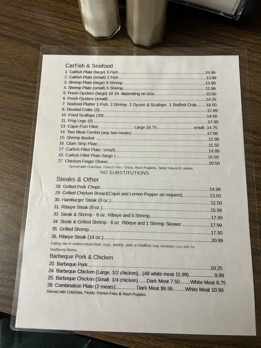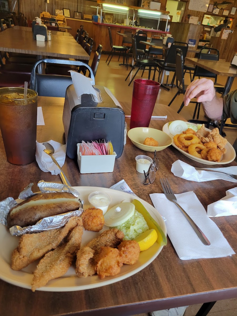 We enjoyed a couple of small catfish platters, which were anything but small. The fish was fried perfectly and served piping hot. Our waitress was super nice. Hope to eat there again soon.