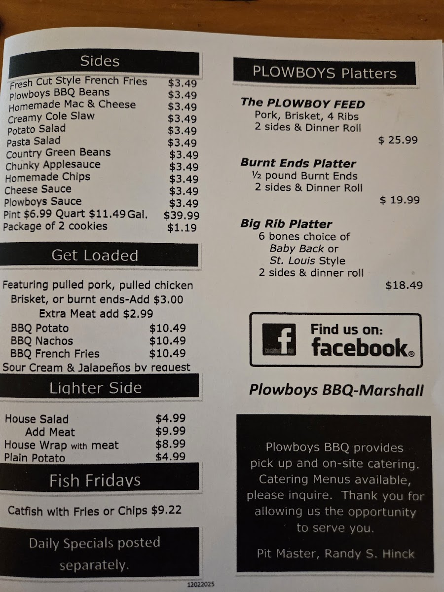 Choose from: Fresh Cut Style French Fries, Plowboys BBQ Beans, Homemade Mac & Cheese, Creamy Coleslaw, Potato Salad, Country Green Beans, Homemade Chips.