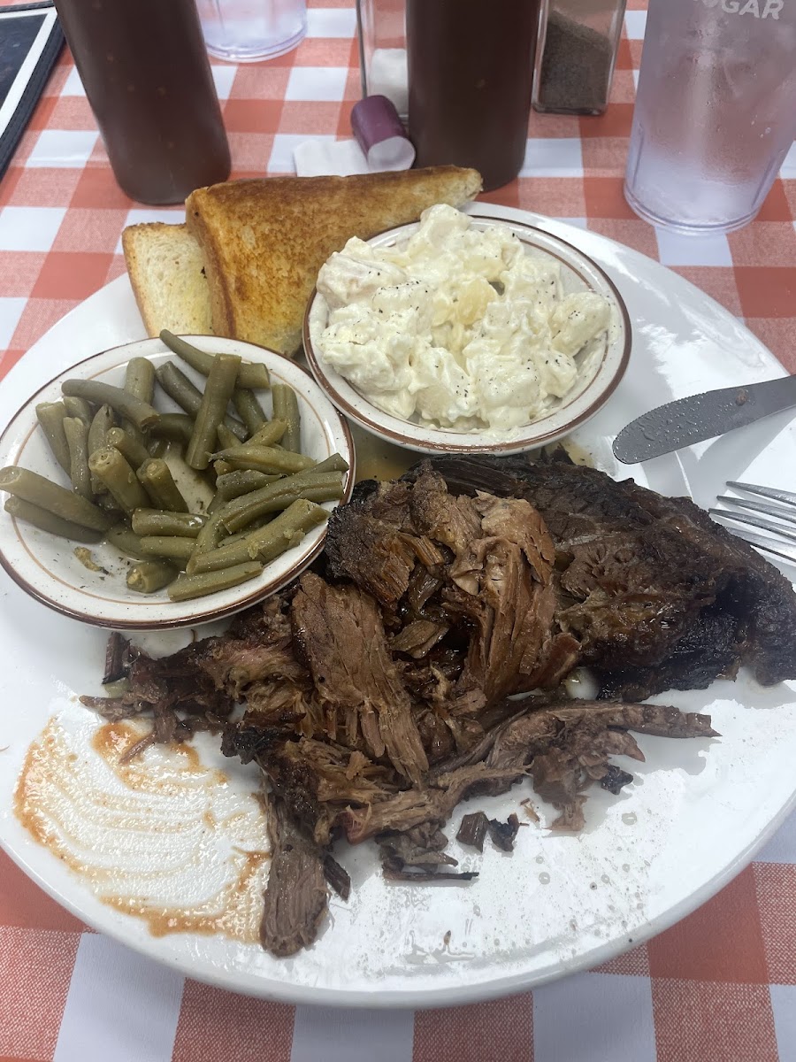 Loved this place. Patty served us and she was great. Making sure we had everything we needed without being over baring. The restaurant was clean inside and out. Now for the best part the food. I ordered the bbq brisket with Mac and cheese and a side salad. The side salad was pretty big and tasted like.......salad. mac and cheese was nice and creamy like velveta mac and cheese. The brisket was the best I've tasted and would love to go back here for it, even if I had to use the driver through. Key lime pie was for desert and that was good too. If you are in the area or passing through Tennessee you most stop here for some bbq.