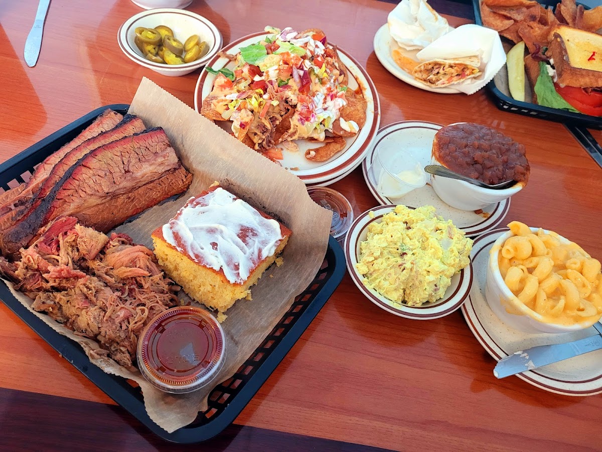 First time here and it won't be the last. Started with a 1/2 order of nachos. Only $5 and was a dinner sized portion. They use homemade kettle chips. Delicious. Sampled all of the meats. Ribs fell off the bone. Everything was super tender. Flavor was good. Husband said pork may have been a little heavy on the smoke, but I didn't mind. House BBQ sauce was delicious. Baked beans were good. Garlic mashed potatoes were good too. Mac and cheese was good but the sauce could have been a little thicker. Would like to see a Carolina sauce added, maybe other flavors as well. We definitely plan on coming back. Very well priced and tasty. Friendly staff. I want to add, I'm not normally a fan of cornbread. But their cornbread, with the honey butter (I think) that comes with it, is SO good. Melted over top, wow. I'm getting hungry thinking about it.