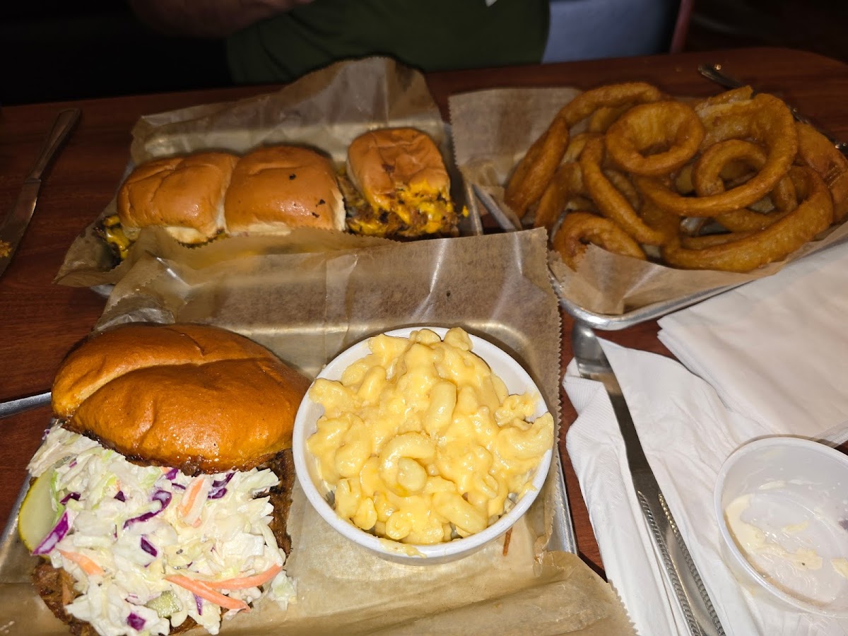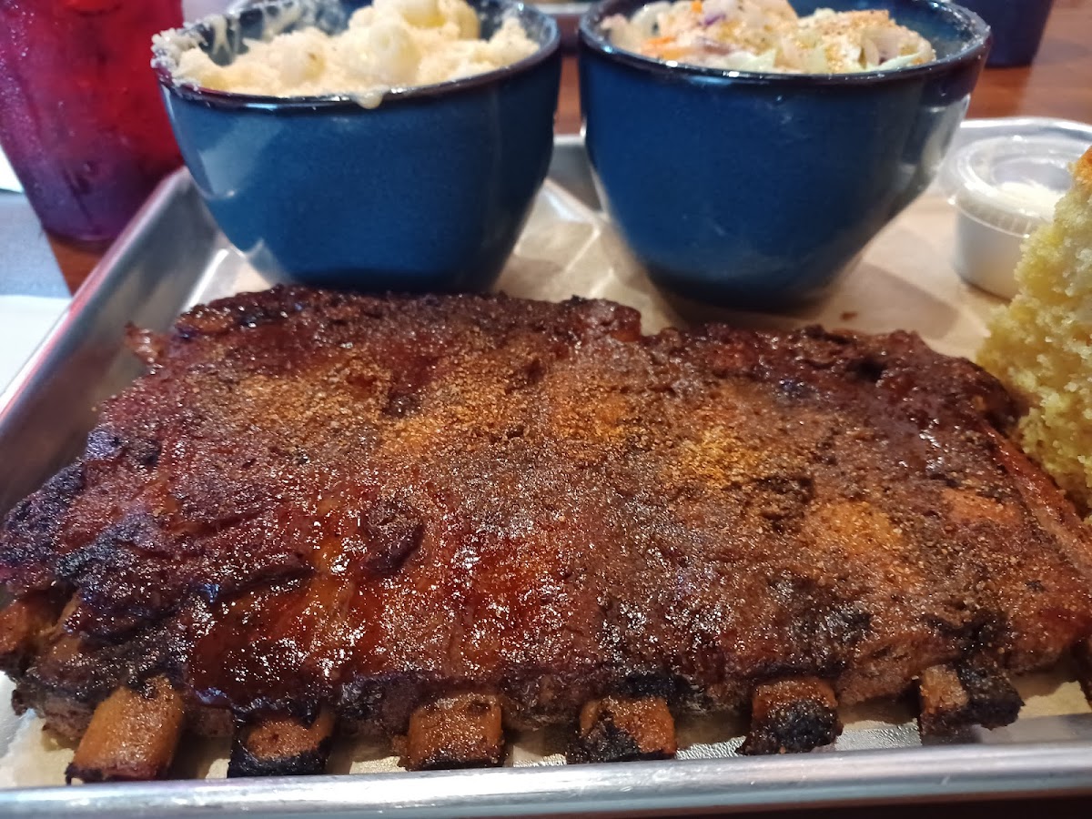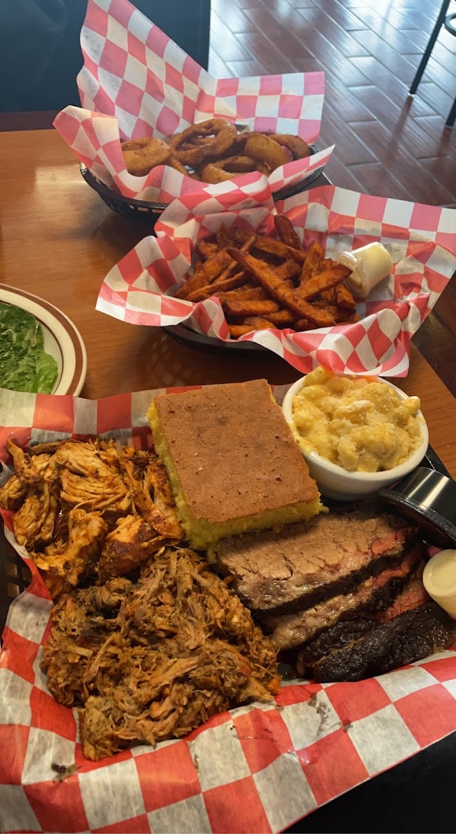 Excellent bbq. We got the whole slab of ribs, onion rings, mac and cheese, chicken, pulled pork and brisket. The ribs and brisket were the best. Very good table side bbq sauces. Corn bread is delicious and sweet. Quick service. Hot food. Scrumptious. Great sized portions. American food at its best. The chicken was dry but the waitress said its mostly tender. Sometimes at the end of the day, it's dry.