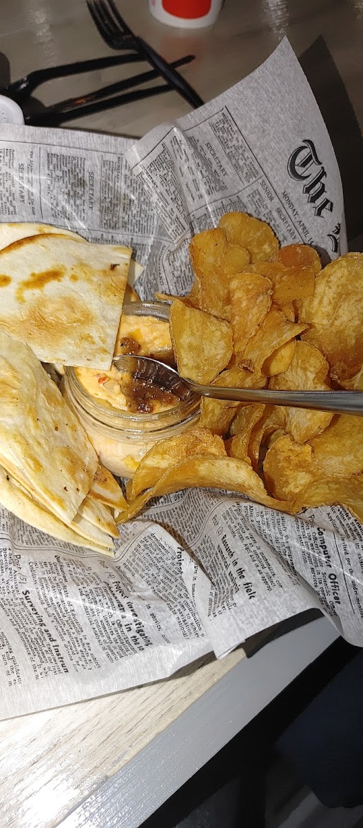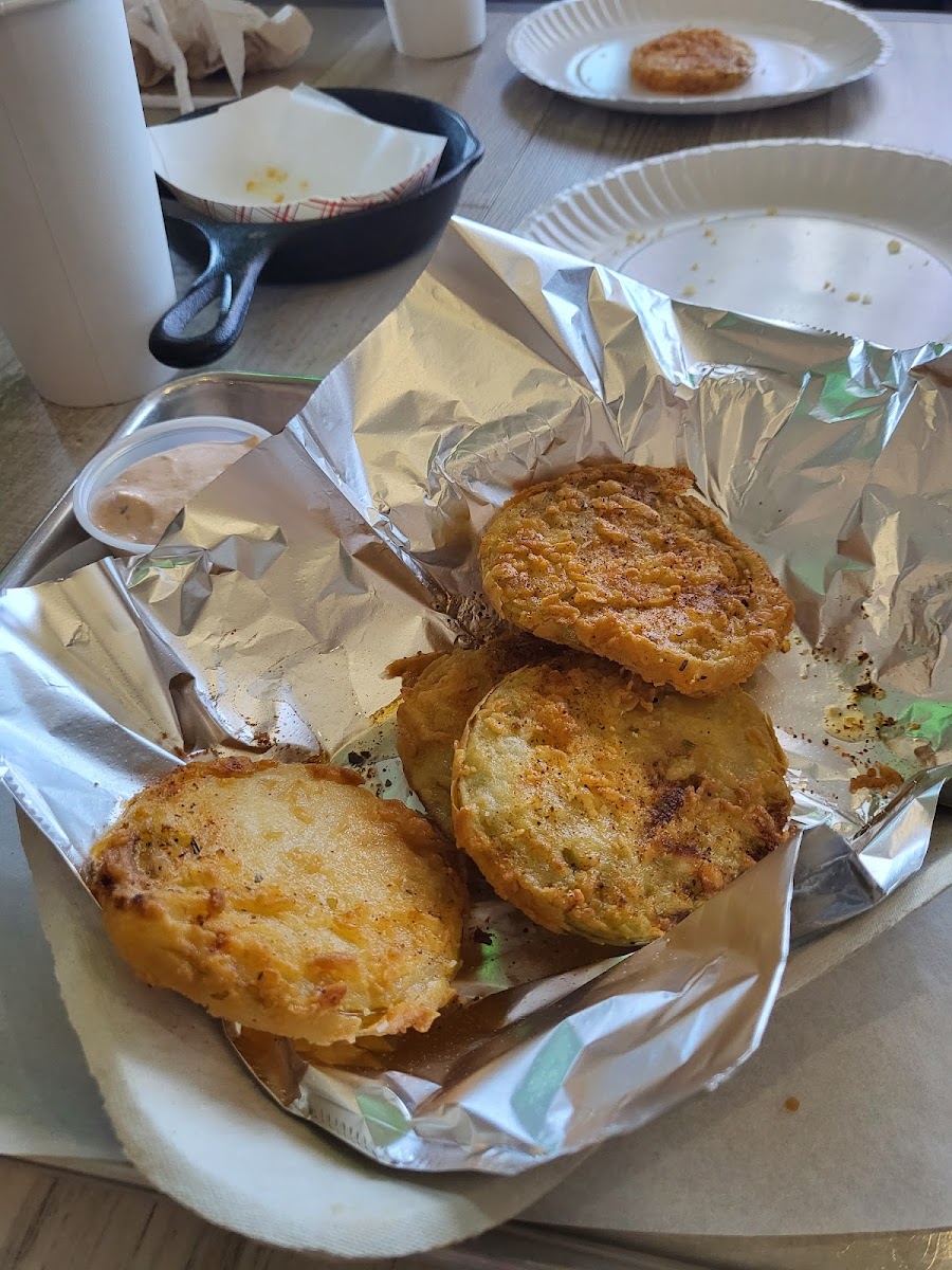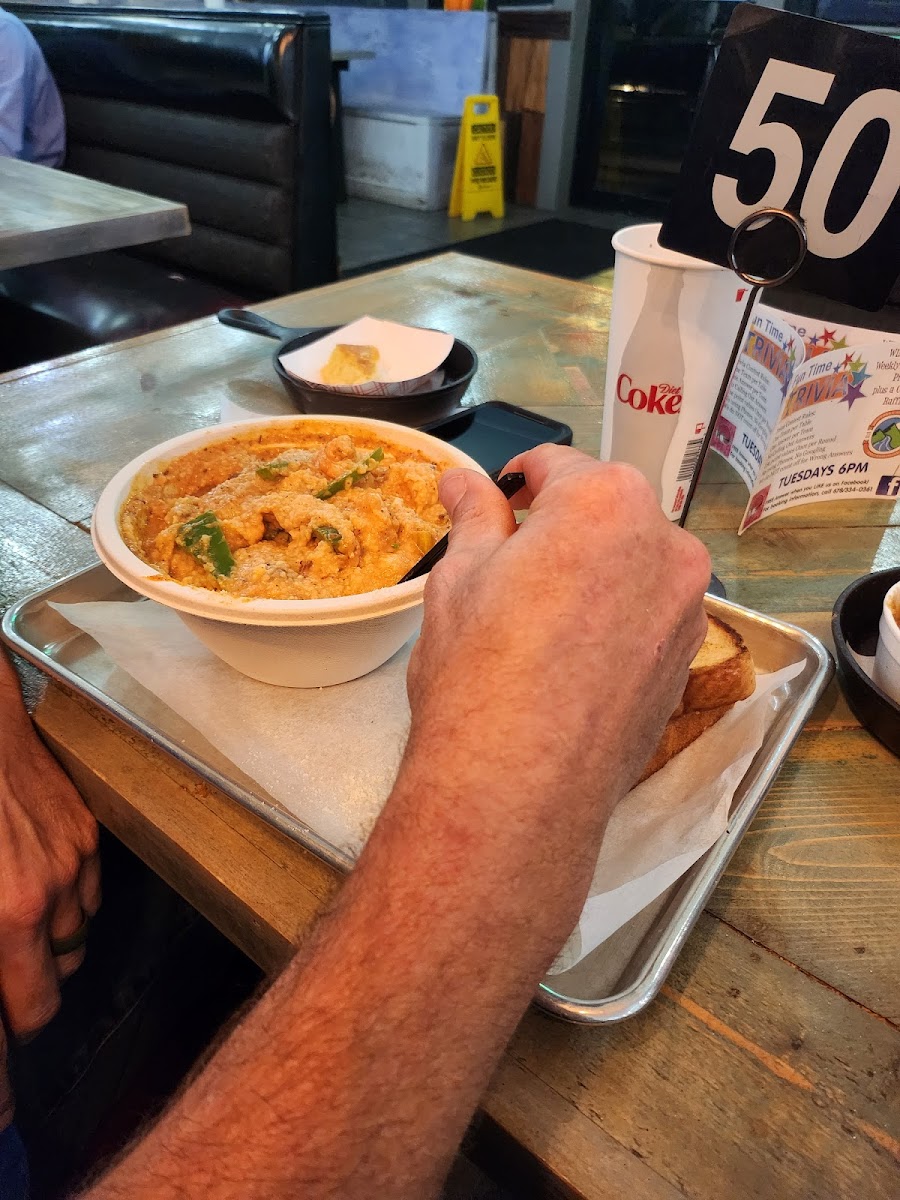 Although we have had takeout from here a few times , this was our first chance to dine in at this gem. From the start you receive a rousing welcome . Matt , the owner, is convivial host , and made us feel like family. We ordered what was probably way too food , and shortly the parade began. The servers work as a team , and keep the food coming out fresh and hot . For starters we had the fried green tomatoes served with ranch and the smoked pimento dip served with fried-in-house pita chips . My wife scarfed down the ‘maters before I could get a picture(almost) let alone get one . The pimento dip was absolutely amazing and had a complex medley of flavors that virtually danced upon the tongue. On to the main course , my wife ordered the wings , sweet potato fries and collard greens. It was a lot of food . My wife loves the wings and swears the collards are the best around. The sauces are all made in-house and delicious. I had the brisket sandwich and fries . The brisket is smoked to perfection , and piled on the bun . This is a FAT sandwich . It’s so flavorful that it’s almost a shame to add the sweet and tangy bbq sauce… almost . From the food to the people the occasion was seamless and we can’t wait for our next visit . If you haven’t been , or if you just haven’t been in a while you owe yourself the trip .