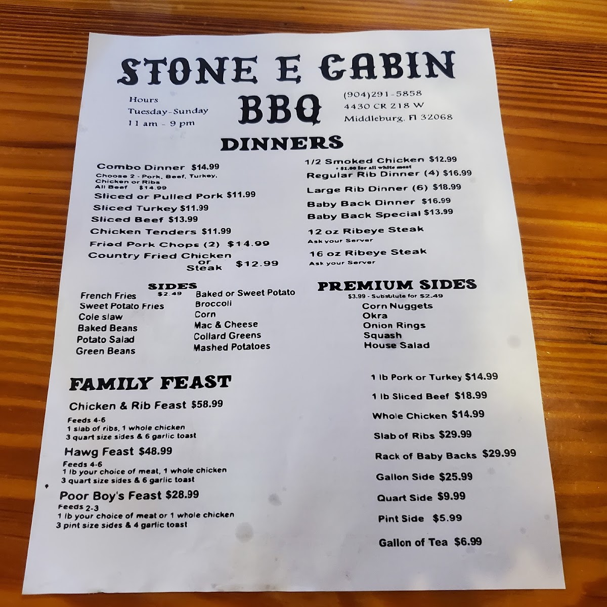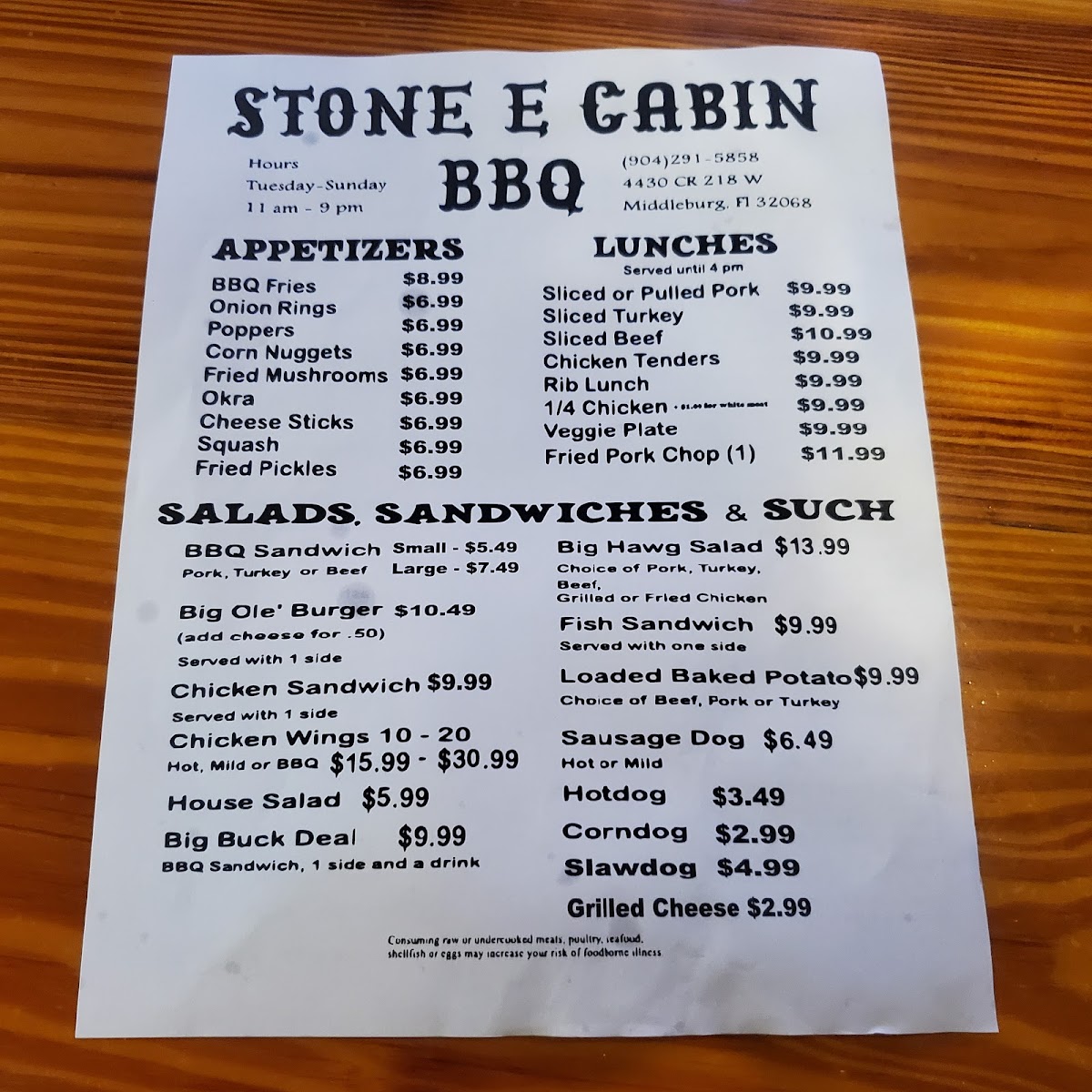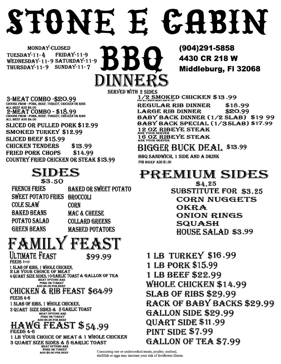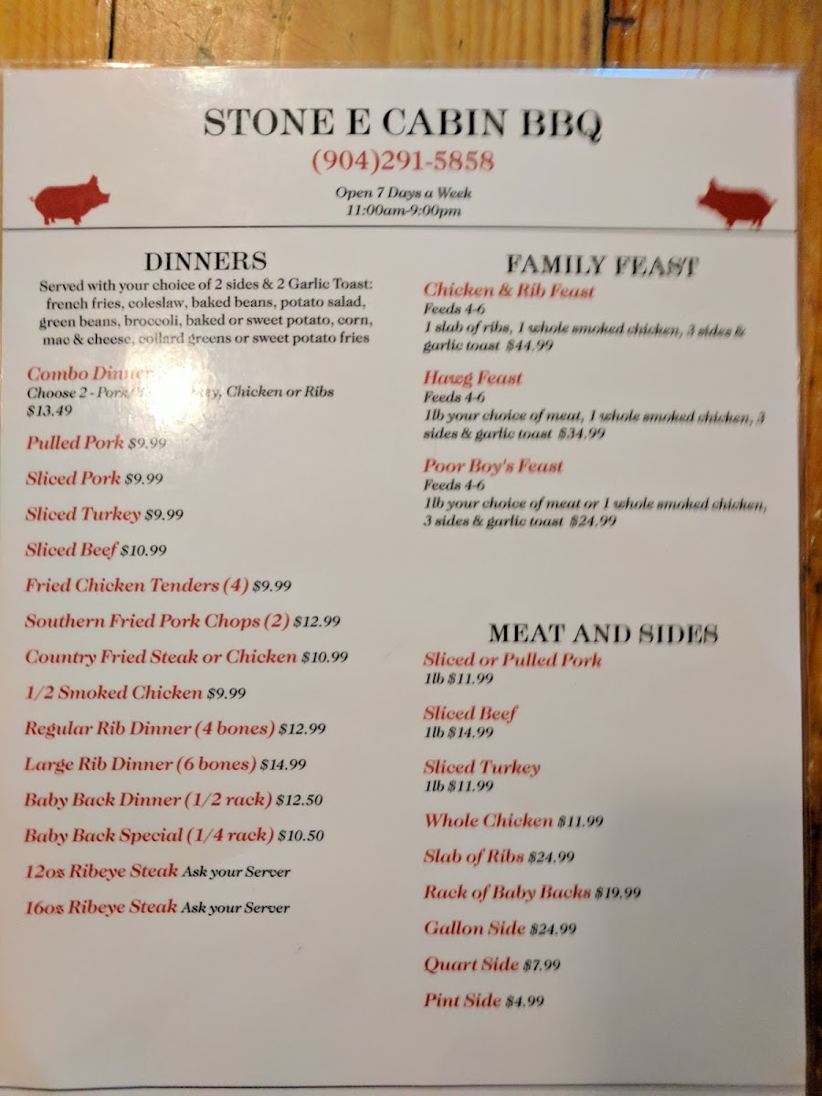 Stone E Cabin Menu