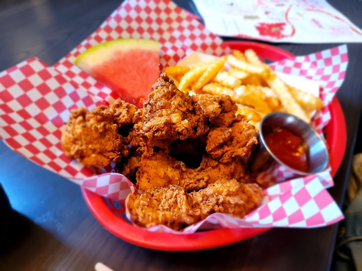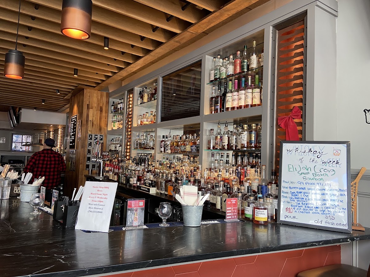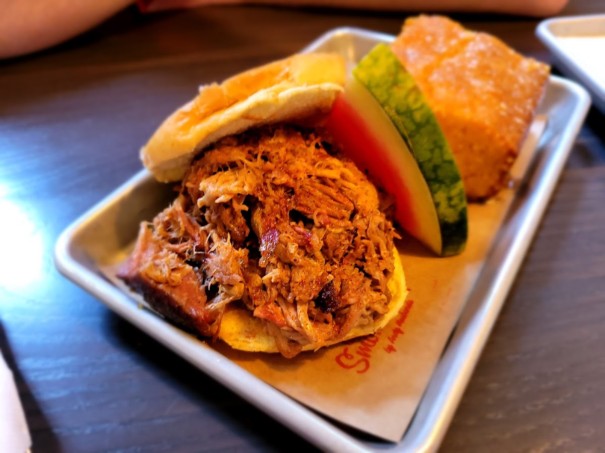 Restaurant week lunch: Chilled BBQ chicken summer rolls and dipping sauce, relish, pickles side of fries and greens. Pulled BBQ chicken sandwich. Pit boss ; pork ribs, sausage and burnt ends, coleslaw, potato salad and beans. Chicken summer roll sauce is very spicy. The pickles are tasty but the spicy dusting of herbs really isn't necessary. Very colorful dish but not enough chicken. Fries were good but not freshly made. The chicken sandwich was Pulled chicken and fairly generous. The potato salad, coleslaw and beans are good. The meats; pork ribs, burnt ends seemed like leftovers warmed up and saucy sweet. Although there is a smoke flavor the sauce is overdone. The burnt ends are fair but almost tortured beyond recognition. The sausage was good. Although it looks odd it tasted good. The sauces are good but somewhat sweet. The gold sauce reminds me of Saltlicks BBQ sauce. BTW- loved the slice of cold watermelon! Angelina was knowledgeable, friendly and professional answer our numerous questions. Clean and comfortable especially if you're looking for a place to chill.