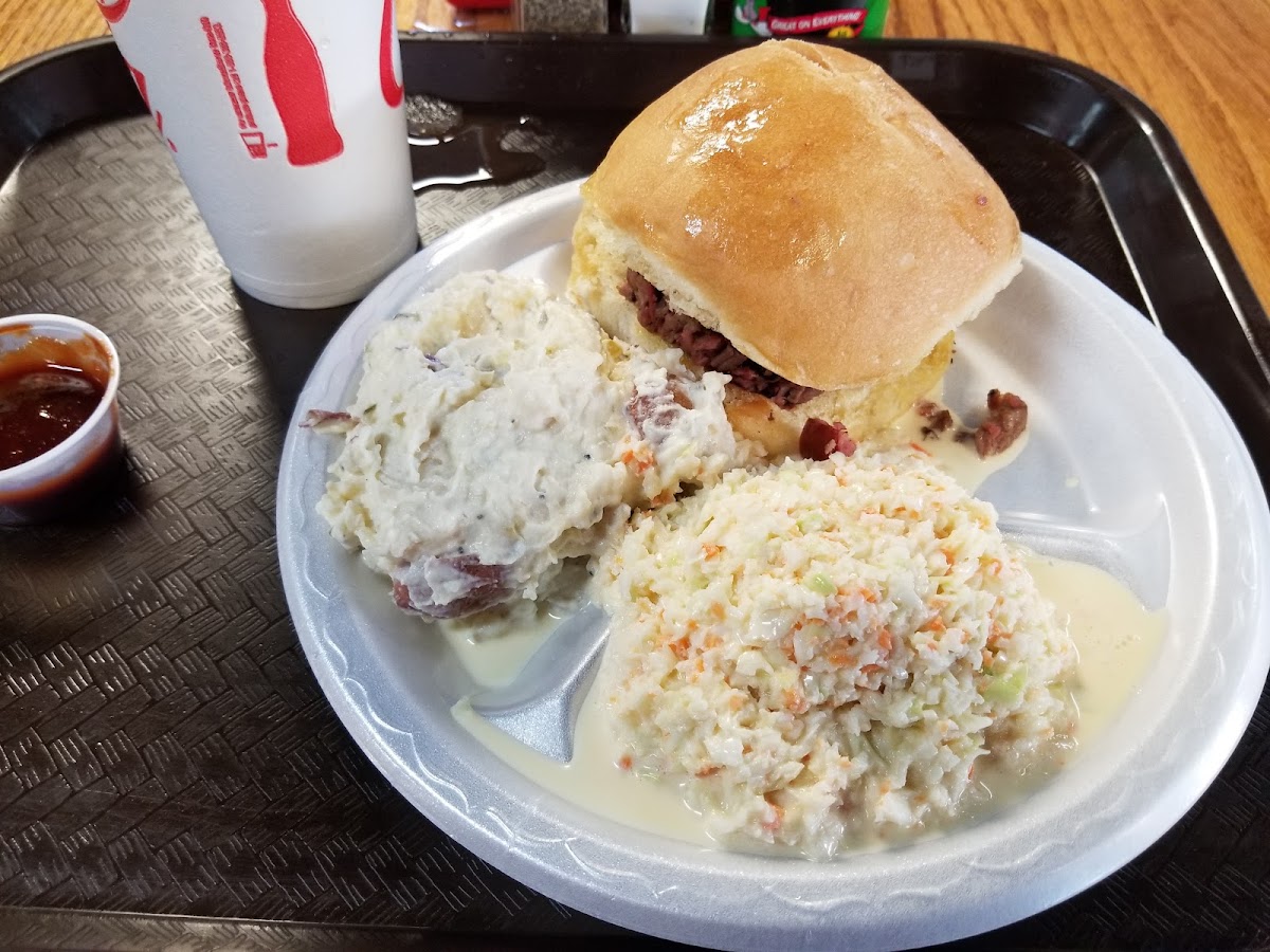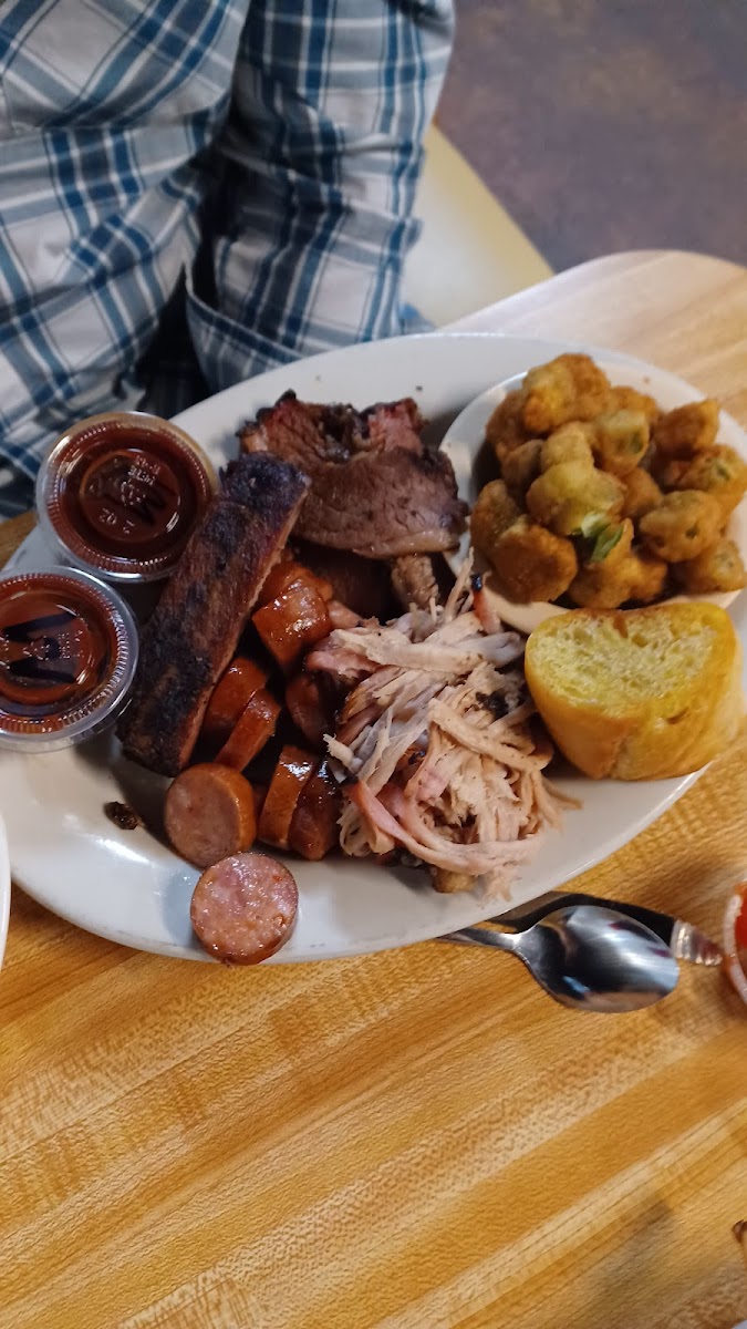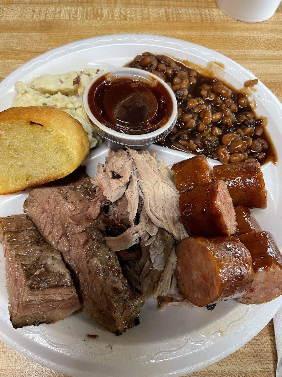 Ate lunch here servers were very friendly and attentive. Inside was empty they do however get a lot of togo orders. Got the three meat plate sliced brisket, pulled pork, sausage. Everything was good not overly smoky and dry. Get the baked beans and mix it in with the pulled pork. Sausage was good too. Only ding id say would be the french bread.
