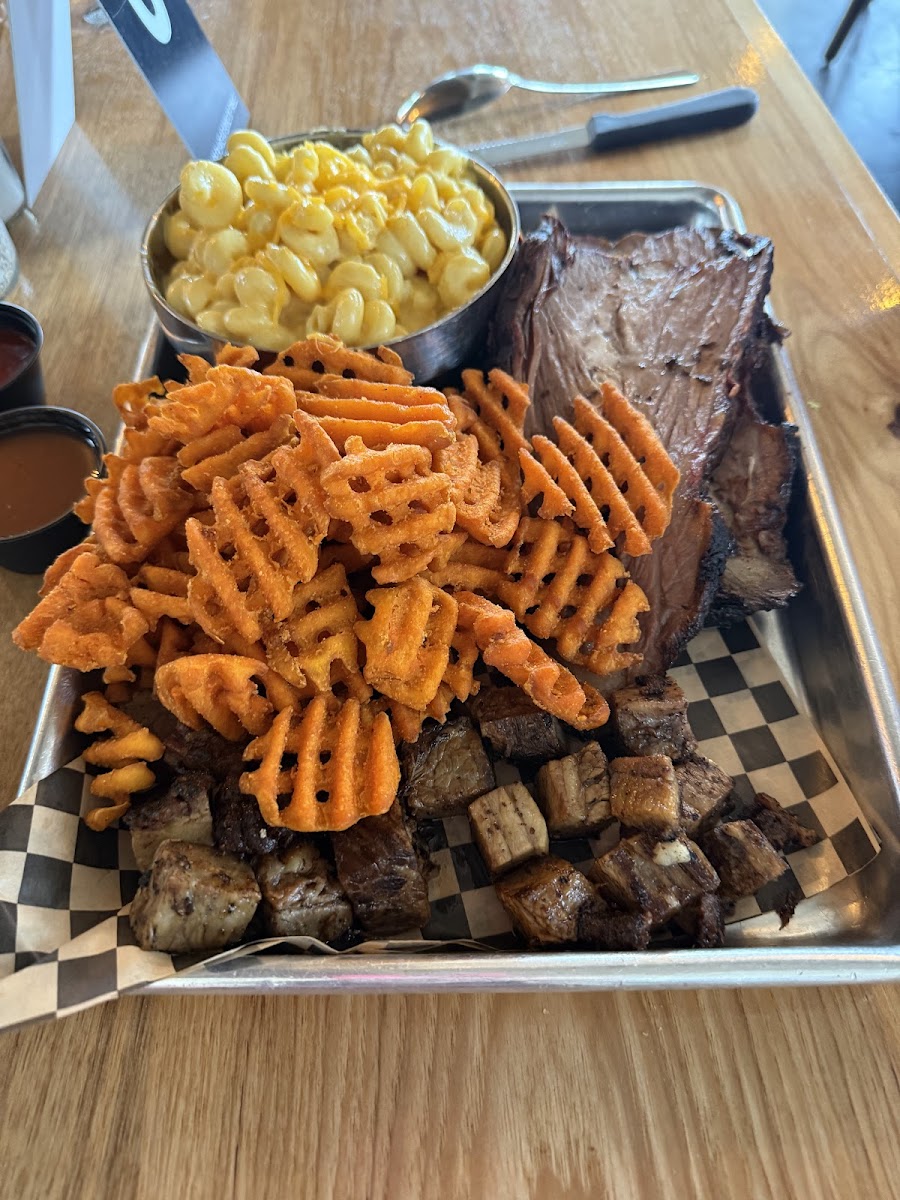 My husband loves the food here! Staff are very friendly and helpful. It's not fancy but it's clean. Order at counter and they bring the food to the table. Husband likes the burnt ends. I like the BBQ bowl with pulled pork and the tangy stout BBQ sauce. Bought a gift certificate for family members to try it. Only downside is no real vegetarian options beyond a side salad or mozzarella sticks.
