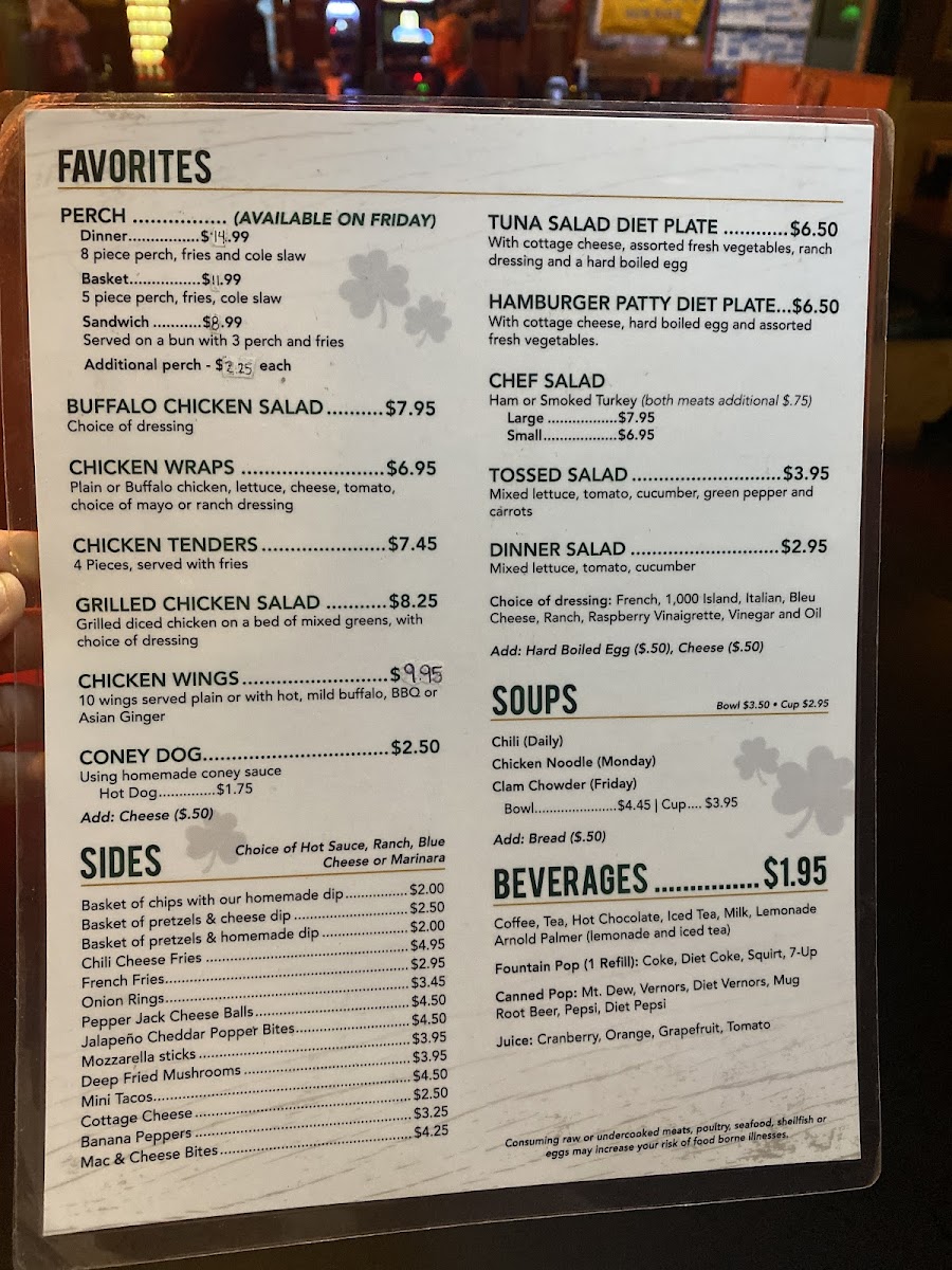 Dinner $16.99 8 piece perch, fries, and cole slaw ; Basket $13.99 5 piece perch, fries, and cole slaw ; Sandwich $9.99 Served on a bun with 3 perch and fries ; Additional perch $2.50 each