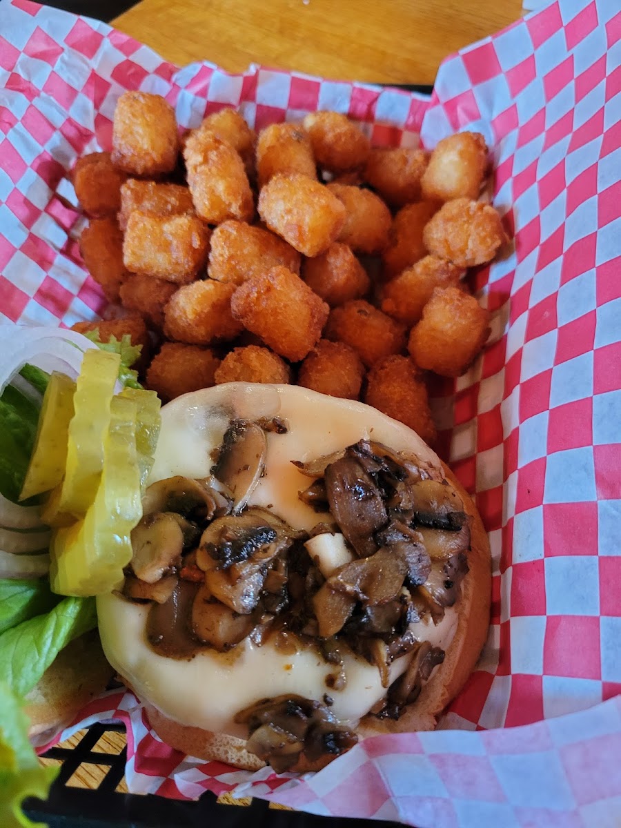 In town for the day and looking for a decent, non fast food place to eat. Saw Duffy's had good reviews. They had a bigger selection of food than I expected. My favorite burgers, Mushroom Swiss, happened to be on the menu, one that is found less and less on restaurants as more "creative" burgers have been created over the years. It is rare that I can find a place that makes it at all AND makes it tasty. This was DELICIOUS. I was so happy the cheese was gooey and the mushrooms were juicy and flavorful, the burger was not dry even though I ordered medium well. The tots on the side were crispy and not greasy. My husband got a bacon cheeseburger with fries and really enjoyed his food as well. The only reason I gave four stars is the cleaning solution smell was overwhelming, if I could give 4.5 I would. Otherwise the staff was helpful and friendly, it was clean, and the food was great!