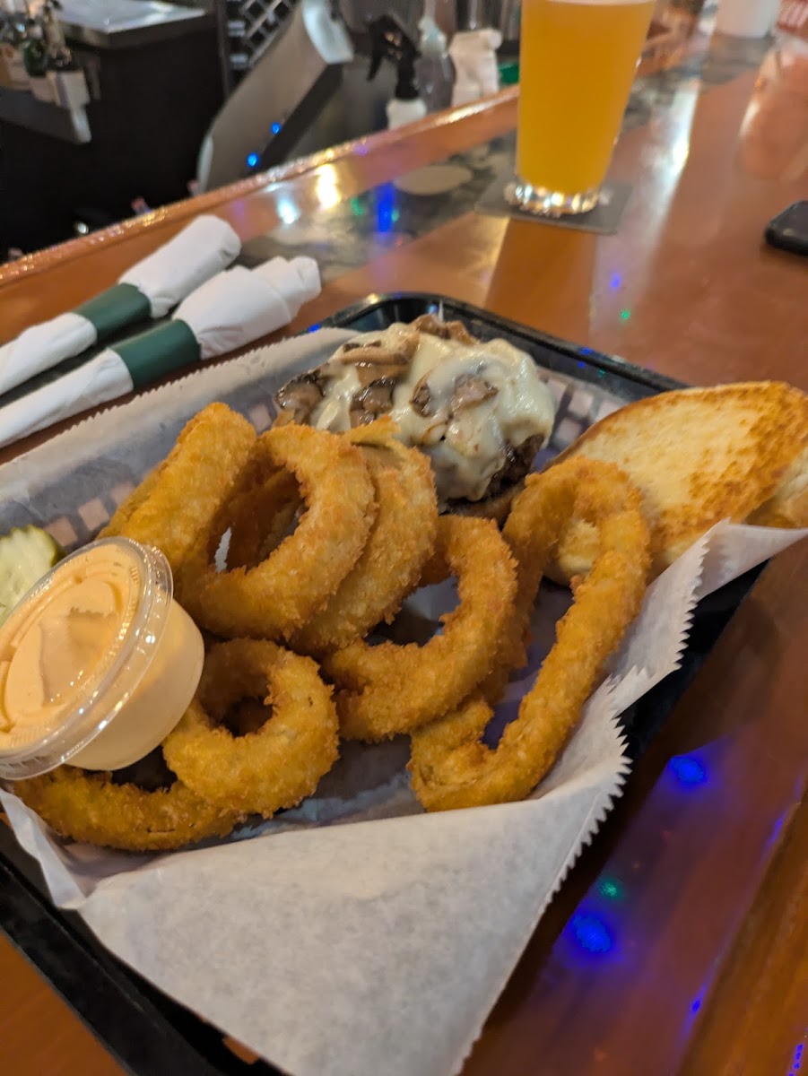 Busy place at 5:00 on a Saturday evening but we didn’t have to wait for a table. Our first time, here but I ordered wings based on recommendation from family members. I had Ranch Dust Parmesan Wings “extra sloppy” as recommended by our server and they were delicious! The sauce was creamy and plentiful. Wings were hot and crispy. Hubby had a crab cake sandwich and fries. Onion rings as an appetizer were also tasty and crunchy. We definitely plan to come back here again as we were very satisfied with our first visit here.