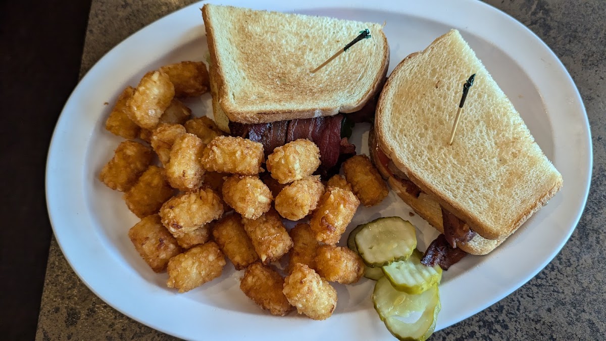 Stopped here after we explored the Newberry National Volcanic Monument area. We had a BLT and a Classic Club. I ordered the tots, my husband had the fries. My BLT was full of nice crispy bacon and delicious tomato. The tots were fantastic, crispy on the outside, soft in the middle. The fries were fabulous too! The Classic Club was delicious. The prices were reasonable, $9.88 for the BLT and $14.50 for the Classic Club, both with a heap of tots and fries. For 2 cokes (free refills) it was $5.20. We were there during lunchtime, it was starting to get busy just before 1 pm. There was a Karaoke machine and 2 gaming rooms. I would recommend this restaurant if you find yourself in LaPine and hungry.