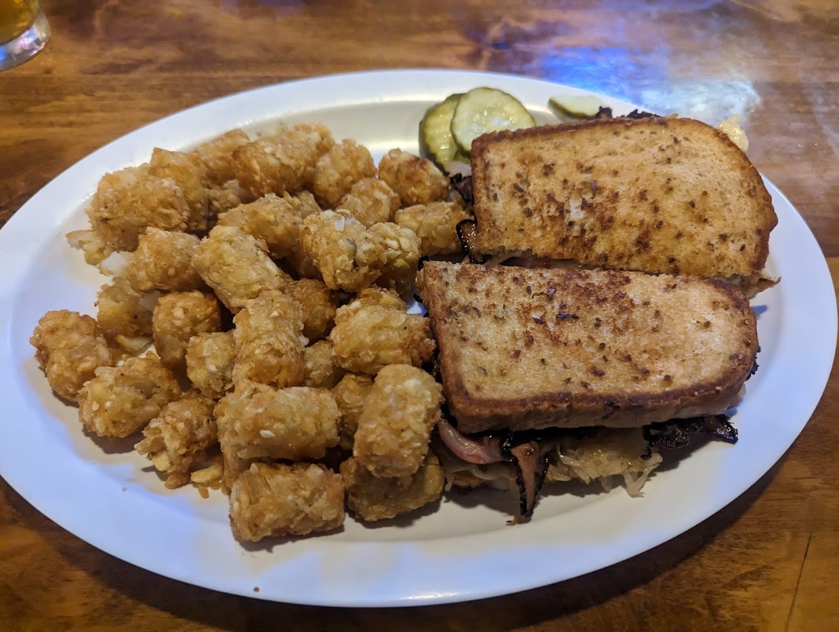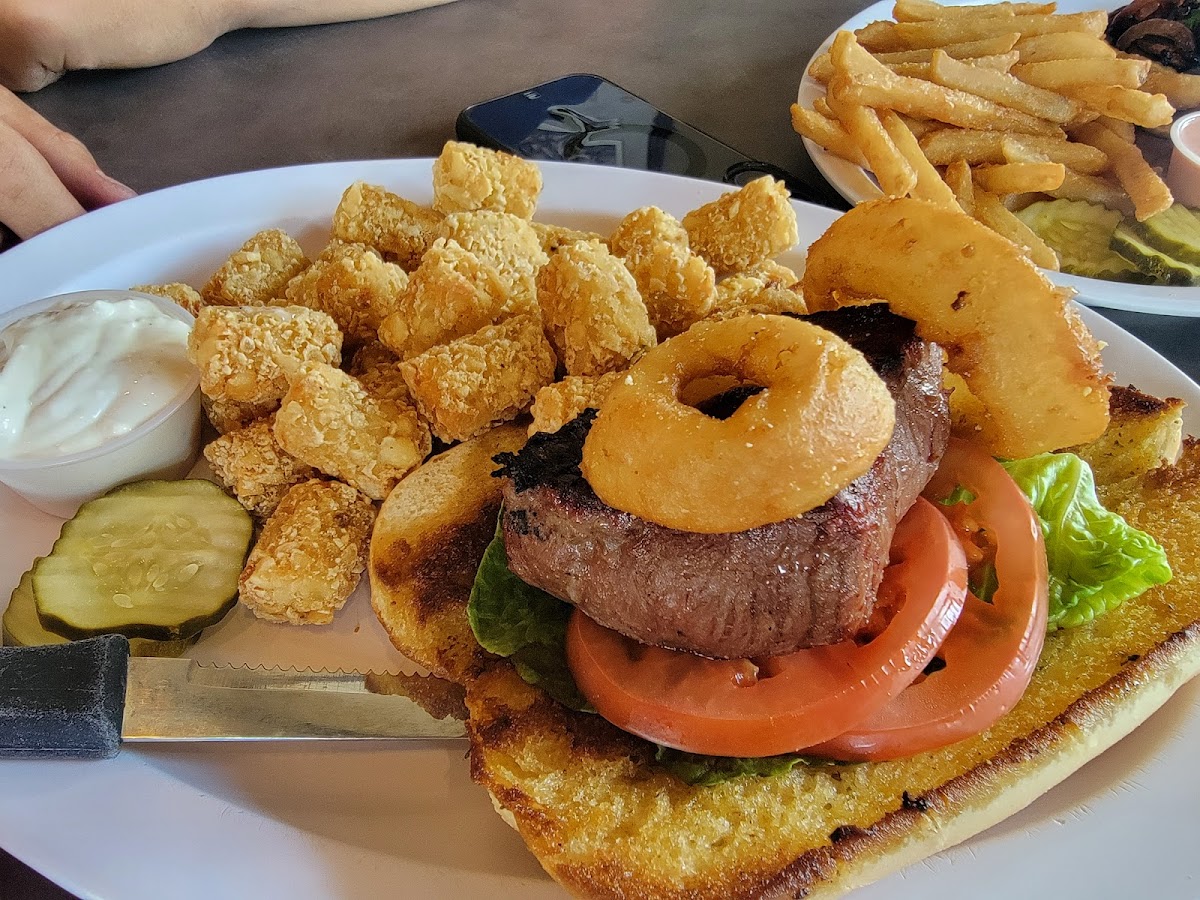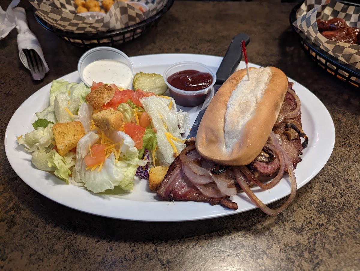 I took this photo after having removed the knife and the onion ring topper. I also had already smashed it down some and consumed the other half! Haha! We visited the area and were pretty hungry. Wikiup Station Sports Pub did NOT disappoint! With a definite pub atmosphere, be prepared for some noise! I ordered the BBQ burger with tots. 10/10! It was saucy and juicy, but also held together as I ate it.