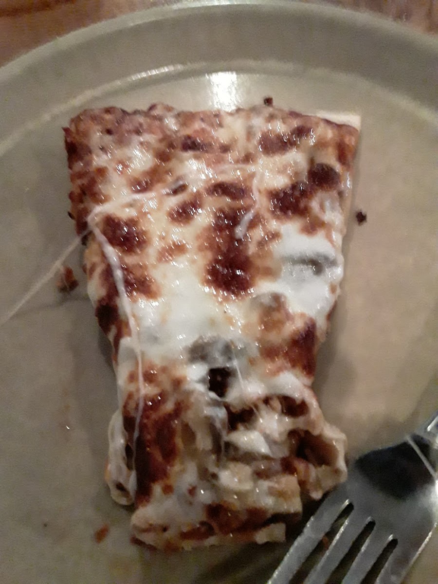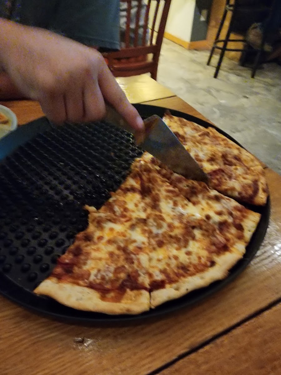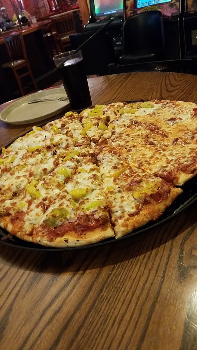 Pizza was amazing. Nice crisp thin crust, sauce with a little kick, generous toppings on our 18" Italian sausage and mushroom. Server was friendly, courteous and refilled our drinks timely.