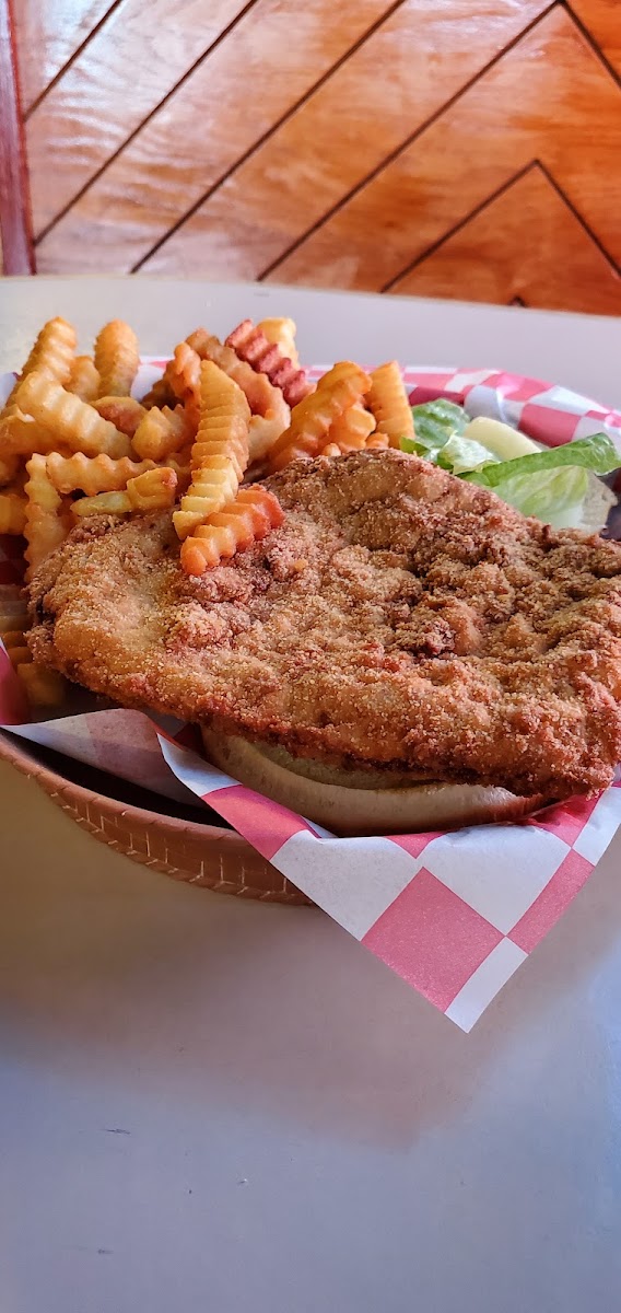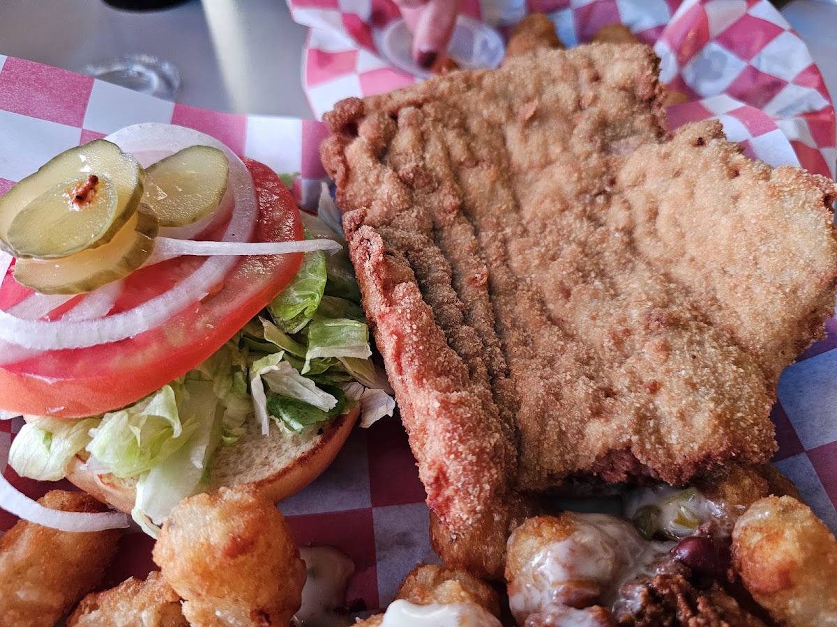 Ok so we came for their famous Indiana tenderloin. It didn't disappoint. It is not hammered out too thin. Instead it is a large thicker breaded tenderloin and is very juicy and good. This is a nice clean restaurant and bar. It is very easy to find using Google Maps. The service was very good. There is plenty of free parking in their large lot.