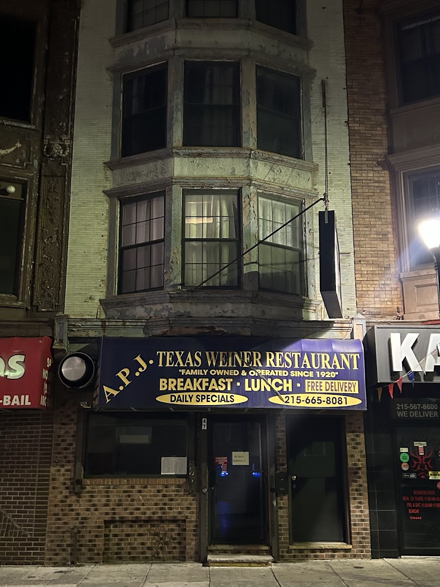 A. P. J. Texas Weiner is situated at 47 N 13th St, Philadelphia, PA 19107, United States and serves as a breakfast restaurant with 58 user reviews. Peak dining times often fall in the early evening from 6:00 PM to around 8:00 PM Monday through Wednesday, with Saturday and Sunday evenings also seeing wait times up to 15 minutes. Thursdays and Fridays usually have minimal or no wait. The menu highlights include the Texas Weiner, Fish and Grits, Omelette, and Tarte Tatin, making it a spot for classic and hearty breakfast and brunch options.