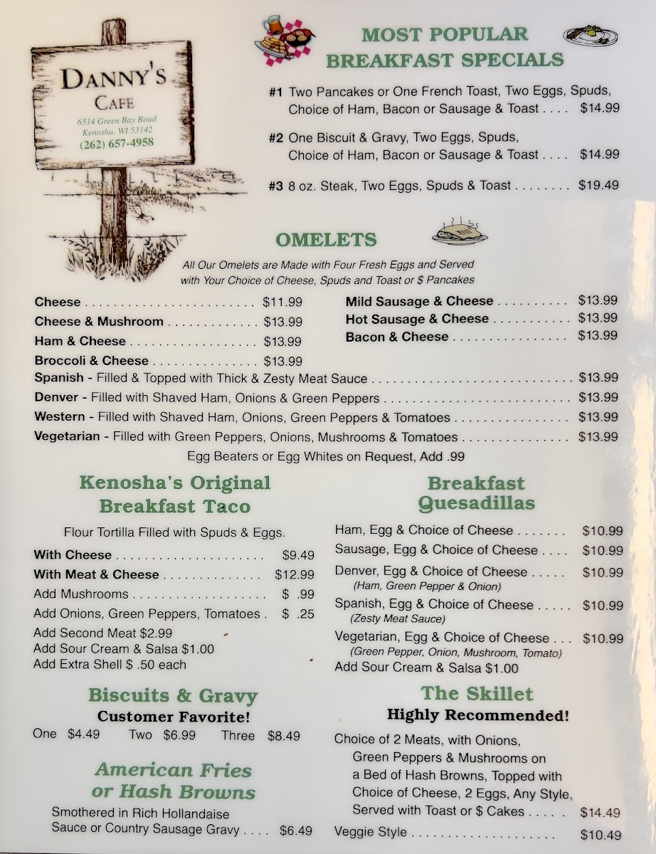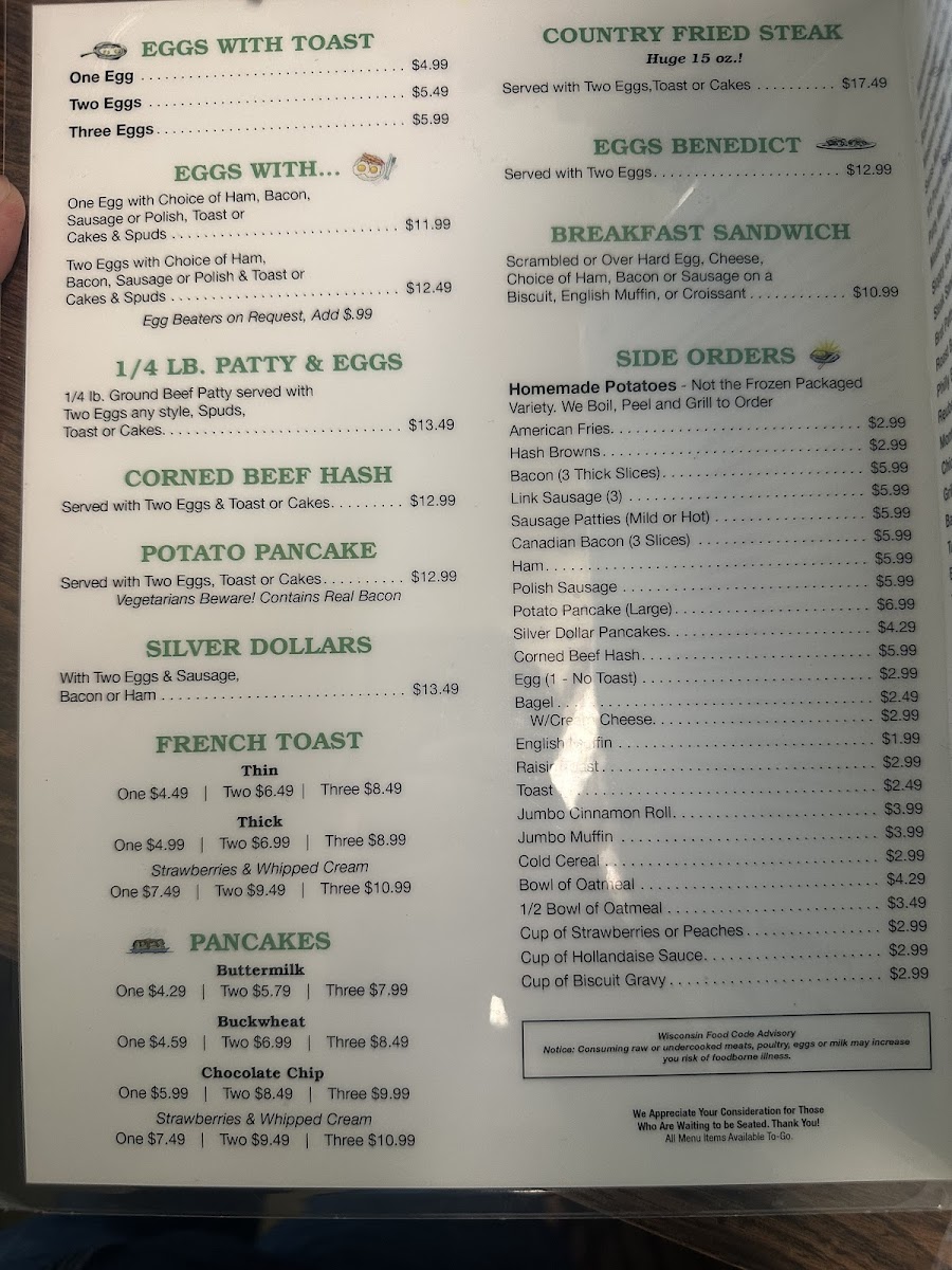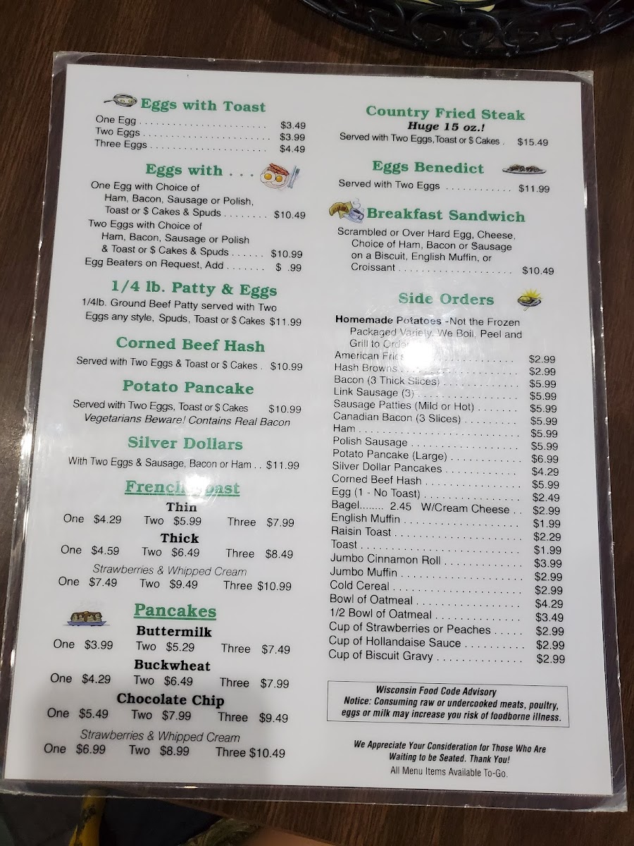 #1 Special- 2 Pancakes Or 1 Thick French Toast, 2 Eggs, Spuds, Meat, Toast